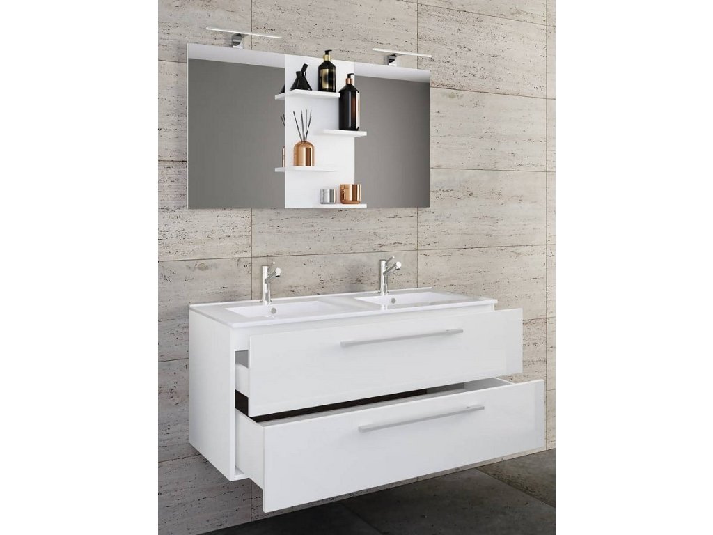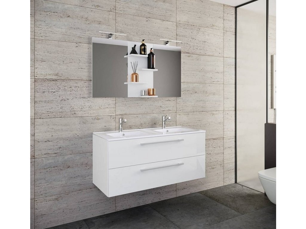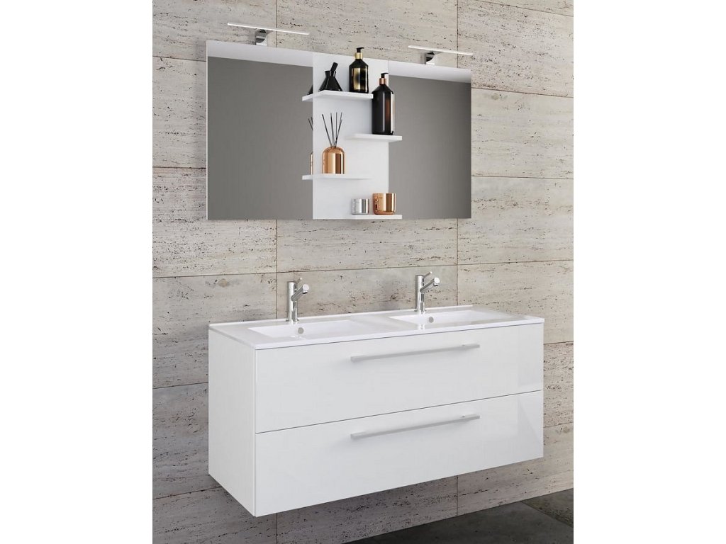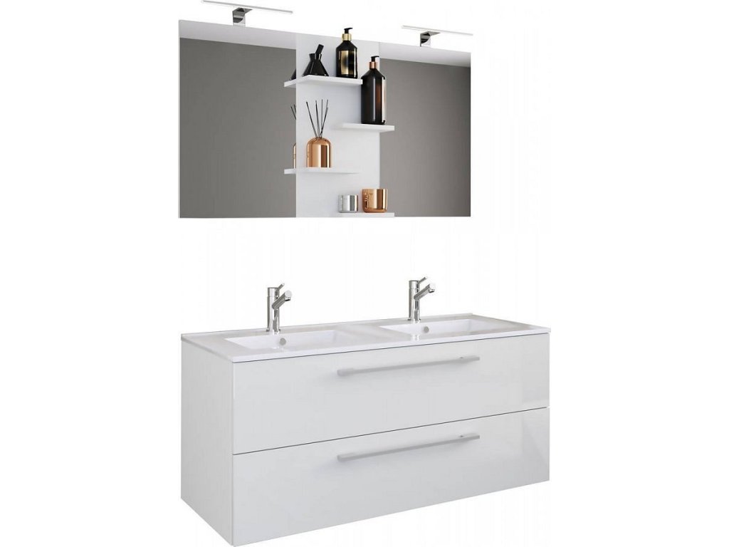 Sada obsahuje: - 1x spodní skříňka se dvěma zásuvkami - 1x dvojité keramické umyvadlo - 1x zrcadlo se čtyřmi odsazenými policemi Sada koupelnového nábytku VCM "Budasi" se skládá ze spodní skříňky se dvěma zásuvkami na stabilních kovových kolejnicích a zrcadla se čtyřmi odsazenými policemi. Moderní dvojité umyvadlo z masivní keramiky slouží jako poutač a dodává vaší koupelně velmi zvláštní atmosféru. Skříňka pod umyvadlo - rozměry cca v. 51 x š. 111 x h. 46 cm - Korpus s robustním a necitlivým melaminovým povlakem - Dvě velké zásuvky s odolnými kovovými úchytkami Dvojité umyvadlo: - Rozměry cca v. 17 x š. 110 x h. 46 cm - Vyrobeno z robustní keramiky Zrcadlo: - Rozměry v. 59 x š. 112 cm - Čtyři police pro dokonalý pořádek Rozměry každé Š. 20 cm x H. 10 cm - Vyrobeno z bezpečnostního skla ESG Nábytek lze doplnit dalším koupelnovým nábytkem "VCM Budasi & Badinos" a osvětlením "VCM Blino". Společnost VCM se specializuje na návrh, výrobu a distribuci nábytku s férovým poměrem cena/výkon již od 70. let a již zdobí miliony domácností.