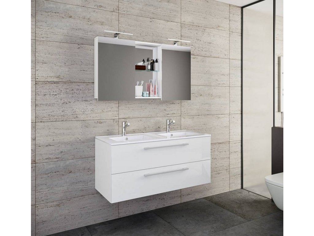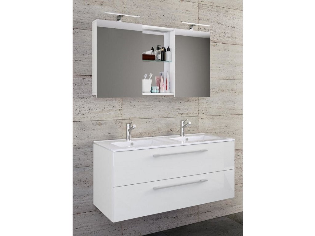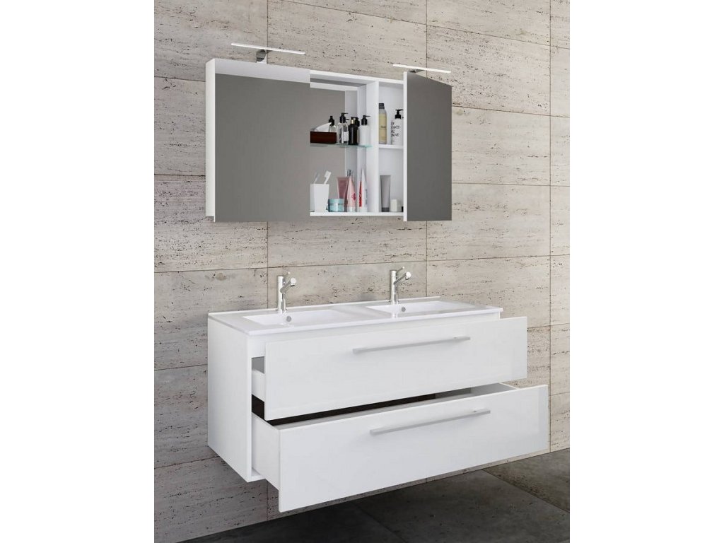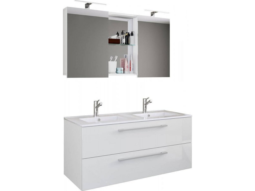 Sada obsahuje: - 1x spodní skříňka se dvěma zásuvkami - 1x dvojité keramické umyvadlo - 1x zrcadlová skříňka se dvěma dvířky, oddělená dvěma viditelnými policemi Koupelnová sada VCM "Budasi" se skládá ze spodní skříňky se dvěma zásuvkami na stabilních kovových kolejnicích a zrcadlové skříňky se dvěma dvířky. Moderní dvojité umyvadlo z masivní keramiky slouží jako poutač a dodává vaší koupelně velmi zvláštní atmosféru. Skříňka pod umyvadlo - rozměry cca v. 51 x š. 111 x h. 46 cm - Korpus s robustním a necitlivým melaminovým povlakem - Dvě velké zásuvky s odolnými kovovými úchytkami Dvojité umyvadlo: - Rozměry cca v. 17 x š. 110 x h. 46 cm - Vyrobeno z robustní keramiky Zrcadlová skříňka: - Rozměry cca v. 59 x š. 112 cm h. 12 cm - Šest polic pro dokonalý pořádek - Vyrobeno z bezpečnostního skla ESG Důraz na detail dělá z koupelnového nábytku VCM něco velmi zvláštního. Umyvadlo lze kombinovat s dalším nábytkem ze série "VCM Budasi". Společnost VCM se specializuje na návrh, výrobu a distribuci nábytku s férovým poměrem cena/výkon již od 70. let 20. století a již jím vyzdobila miliony domácností.