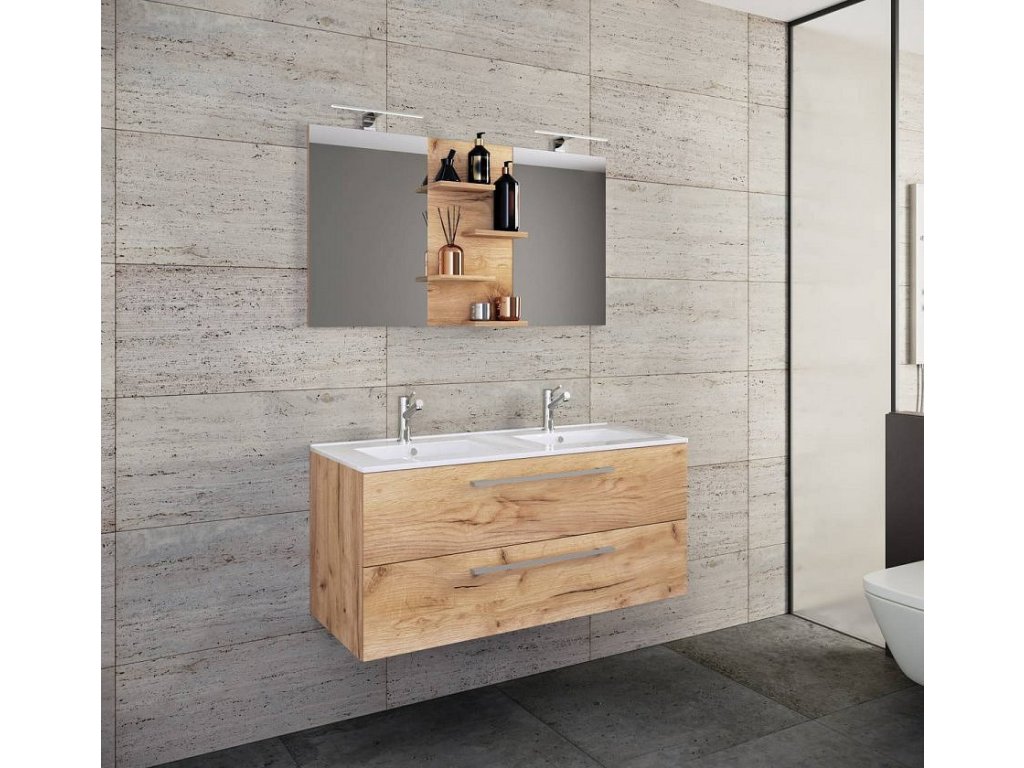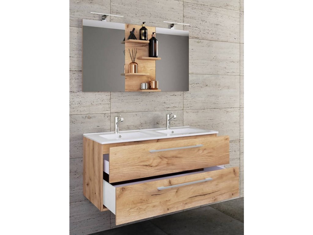 Sada obsahuje: - 1x spodní skříňka se dvěma zásuvkami - 1x dvojité keramické umyvadlo - 1x zrcadlo se čtyřmi odsazenými policemi Sada koupelnového nábytku VCM "Budasi" se skládá ze spodní skříňky se dvěma zásuvkami na stabilních kovových kolejnicích a zrcadla se čtyřmi odsazenými policemi. Moderní dvojité umyvadlo z masivní keramiky slouží jako poutač a dodává vaší koupelně velmi zvláštní atmosféru. Skříňka pod umyvadlo - rozměry cca v. 51 x š. 111 x h. 46 cm - Korpus s robustním a necitlivým melaminovým povlakem - Dvě velké zásuvky s odolnými kovovými úchytkami Dvojité umyvadlo: - Rozměry cca v. 17 x š. 110 x h. 46 cm - Vyrobeno z robustní keramiky Zrcadlo: - Rozměry v. 59 x š. 112 cm - Čtyři police pro dokonalý pořádek Rozměry každé Š. 20 cm x H. 10 cm - Vyrobeno z bezpečnostního skla ESG Nábytek lze doplnit dalším koupelnovým nábytkem "VCM Budasi & Badinos" a osvětlením "VCM Blino". Společnost VCM se specializuje na návrh, výrobu a distribuci nábytku s férovým poměrem cena/výkon již od 70. let a již zdobí miliony domácností.