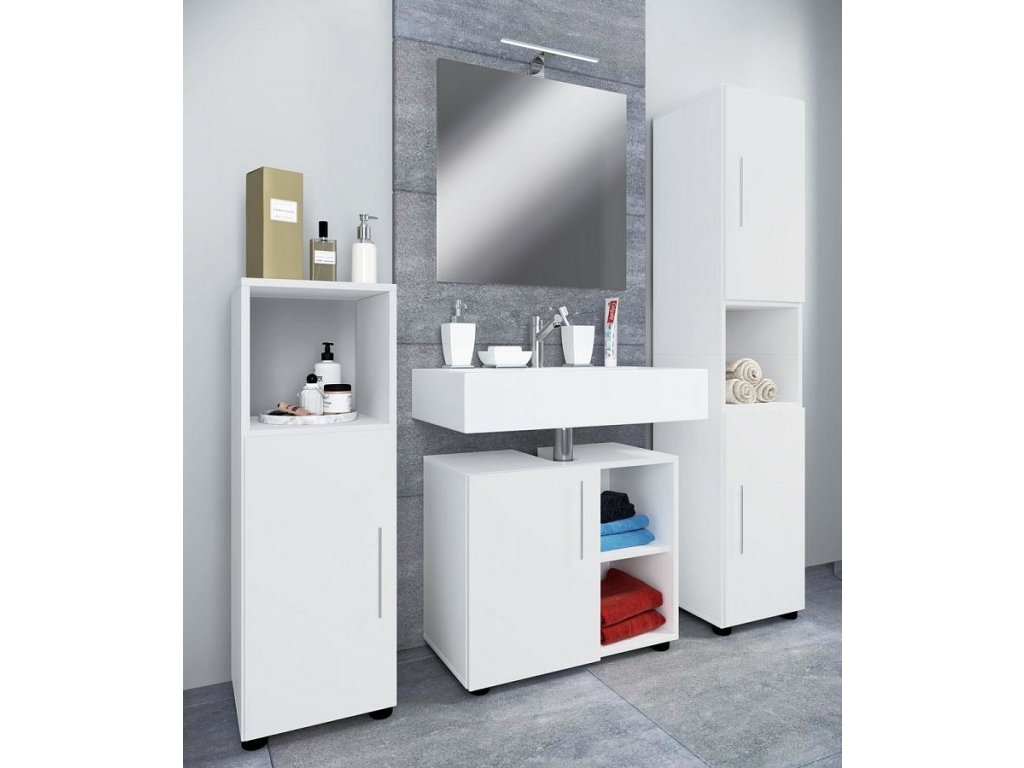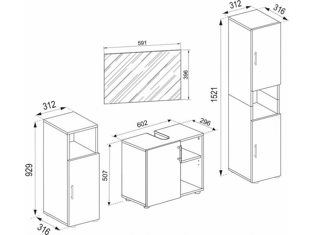 Sada se skládá z: - 1x spodní skříňka - 1x midi skříňka - 1x vysoká skříňka - 1x zrcadlo Koupelnová sada VCM "Flandu II" je nejen vizuálně absolutním vrcholem. Díky jednoduchému a nadčasovému designu se sada hodí téměř do každé koupelny. Díky melaminovému povlaku se koupelnový nábytek obzvláště snadno čistí a je odolný vůči vlhkosti. Spodní skříňka pod umyvadlo: - Rozměry cca v. 51 x š. 60 x h. 30 cm - Dvoje hladce se pohybující otočné dveře s jednou velkou přihrádkou - Stabilní a kvalitní zpracování Midi skříňka - Rozměry cca v. 93 x š. 31 x h. 30 cm - Jedny otočné dveře se dvěma přihrádkami - Jedna další otevřená přihrádka Vysoká skříňka - Rozměry cca v. 160 x š. 31 x h. 30 cm - Dvoje otočné dveře se dvěma přihrádkami - Jedna další otevřená přihrádka Zrcadlo - Rozměry cca v. 40 x š. 60 x h. 3 cm - Zrcadlo z odolného skla - Montážní kování pro bezpečnou montáž na zeď Důraz na detail dělá z koupelnového nábytku VCM něco velmi výjimečného. VCM se specializuje na design, výrobu a distribuci nábytku s férovým poměrem cena/výkon již od 70. let 20. století a vyzdobila jím již miliony domácností.