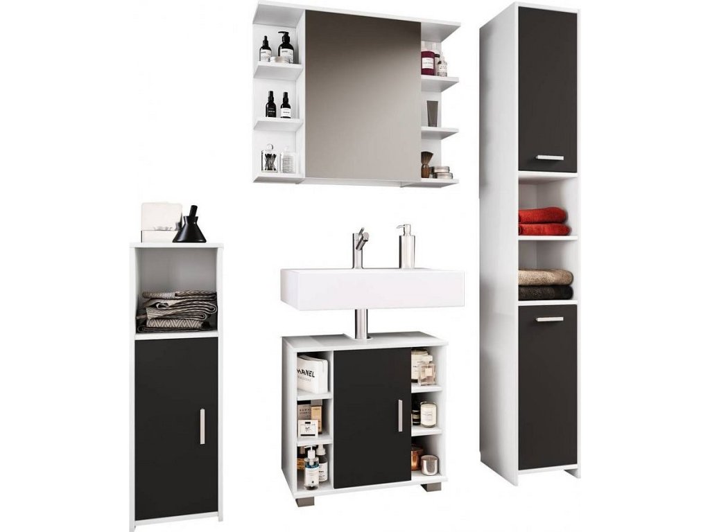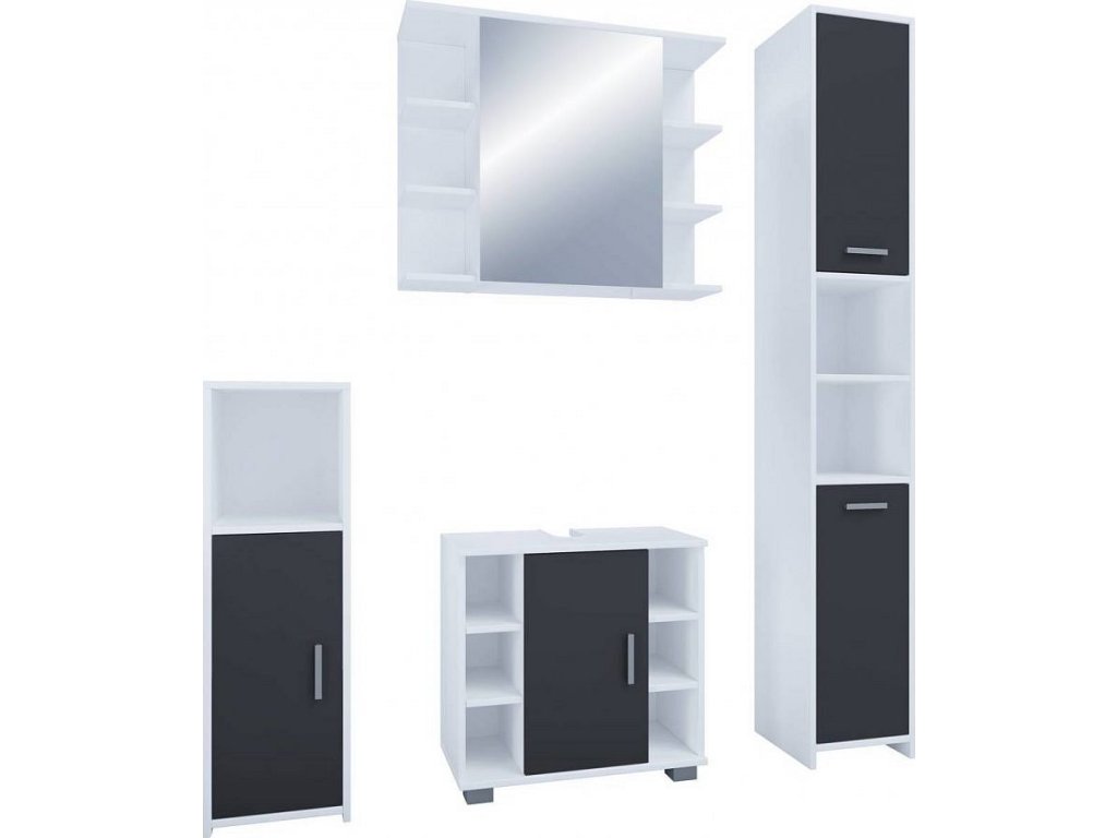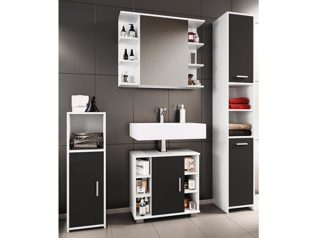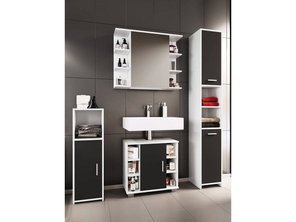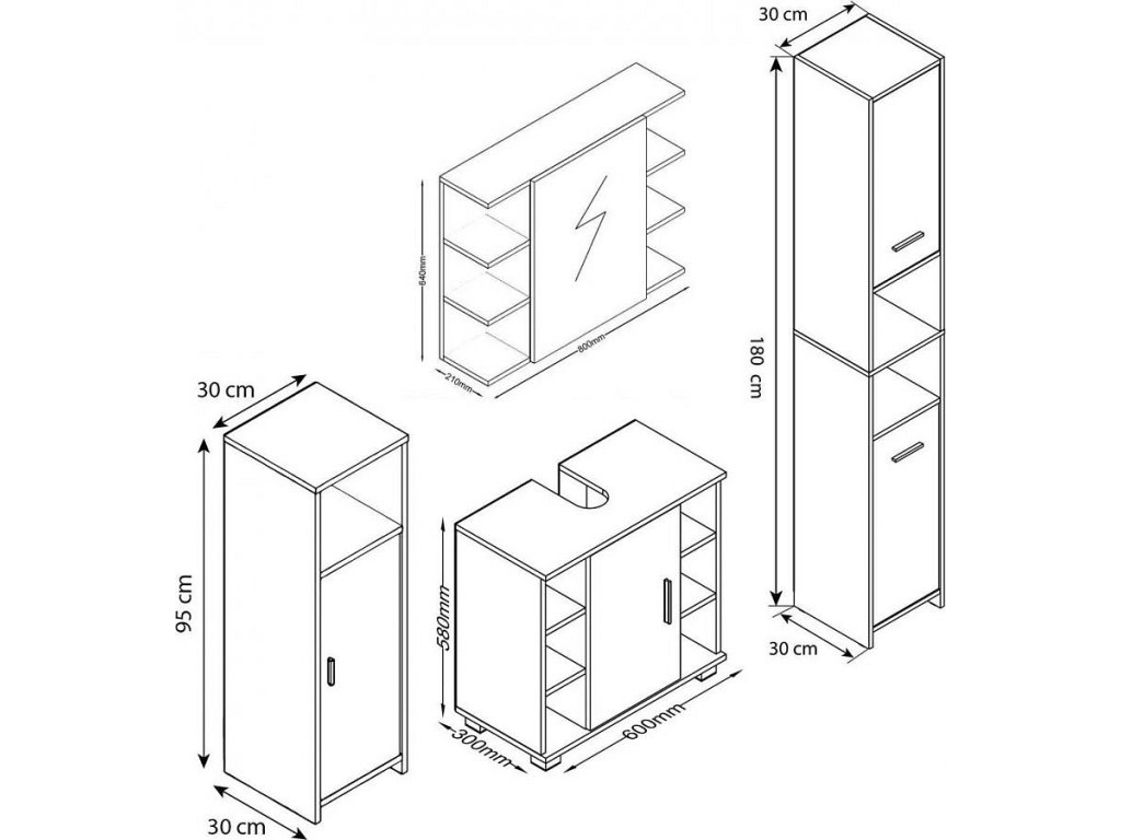Sada se skládá z: - 1x skříňka pod umyvadlo - 1x střední skříňka - 1x vysoká skříňka - 1x zrcadlová skříňka. Koupelnová sada VCM "Zalo II" není jen vizuálním lákadlem. Díky jednoduchému a nadčasovému designu se sada hodí téměř do každé koupelny. Díky melaminovému povlaku se koupelnový nábytek obzvláště snadno čistí a je odolný vůči vlhkosti. Skříňka pod umyvadlo: - Rozměry cca v. 57 x š. 60 x h. 30 cm - Jedny otočné dveře se dvěma velkými přihrádkami - Šest dalších otevřených přihrádek Střední skříňka - Rozměry cca v. 95 x š. 30 x h. 30 cm - Jedny otočné dveře se třemi přihrádkami - Jedna další otevřená přihrádka Vysoká skříňka - Rozměry cca v. 180 x š. 30 x h. 30 cm - Dvoje otočné dveře se dvěma přihrádkami - Dvě další otevřené přihrádky Zrcadlová skříňka z bezpečnostního skla ESG - Rozměry cca v. 64 x š. 80 x h. 21 - Jedna otočná dvířka se dvěma přihrádkami - Dalších šest otevřených přihrádek Důraz na detail dělá z koupelnového nábytku VCM něco velmi výjimečného. VCM se specializuje na design, výrobu a distribuci nábytku s férovým poměrem cena/výkon již od 70. let 20. století a vyzdobila jím již miliony domácností.