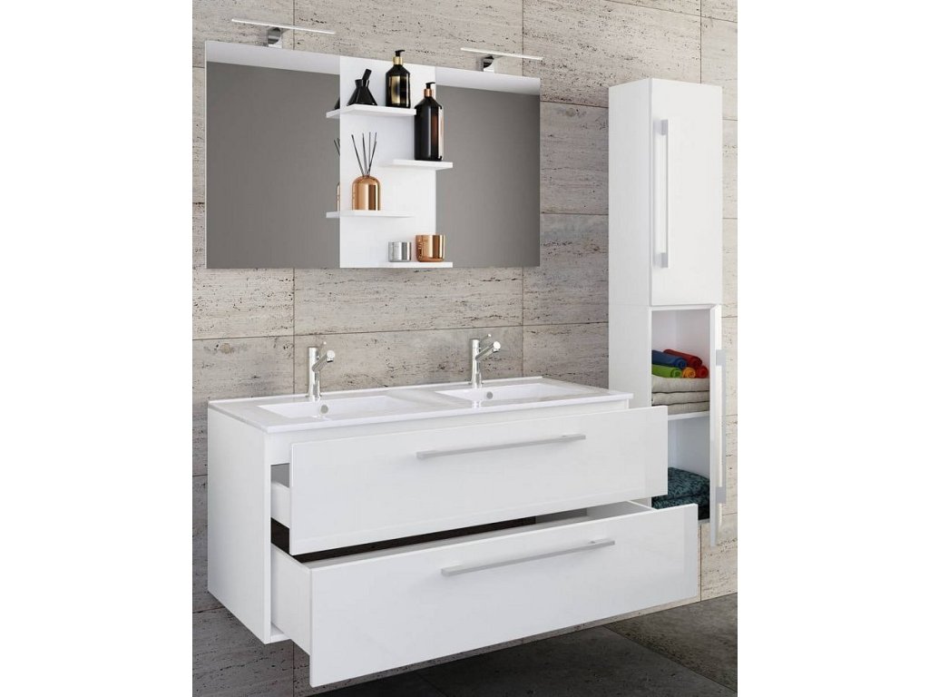 Sada obsahuje: - 1x spodní skříňka se dvěma zásuvkami - 1x dvojité keramické umyvadlo - 1x zrcadlo se čtyřmi odsazenými policemi - 1x vysoká skříňka se dvěma dvířky a čtyřmi policemi Koupelnová sada VCM "Budasi" se skládá ze spodní skříňky se dvěma zásuvkami na stabilních kovových kolejnicích, zrcadla se čtyřmi odsazenými policemi a vysoké skříňky se dvěma dvířky a čtyřmi přihrádkami. Poutavým prvkem je moderní dvojité umyvadlo z masivní keramiky, které dodá vaší koupelně velmi zvláštní atmosféru. Skříňka pod umyvadlo - rozměry cca v. 51 x š. 111 x h. 46 cm - Korpus s robustním a necitlivým melaminovým povlakem - Dvě velké zásuvky s odolnými kovovými úchytkami Dvojité umyvadlo: - Rozměry cca v. 17 x š. 110 x h. 46 cm - Vyrobeno z robustní keramiky Zrcadlo - Rozměry v. 59 x š. 112 cm - Čtyři police pro dokonalý pořádek Rozměry každé Š. 20 cm x H. 10 cm - Vyrobeno z bezpečnostního skla ESG Vysoká skříňka: - Rozměry cca v. 150 x š. 33 x h. 22 cm - Dvě police pro rozdělení prostoru Důraz na detail dělá z koupelnového nábytku VCM něco velmi speciálního. Umyvadlo lze kombinovat s dalším nábytkem ze série „VCM Budasi“. VCM se specializuje na design, výrobu a distribuci nábytku s férovým poměrem cena/výkon od 70. let a již ozdobil miliony domácností.