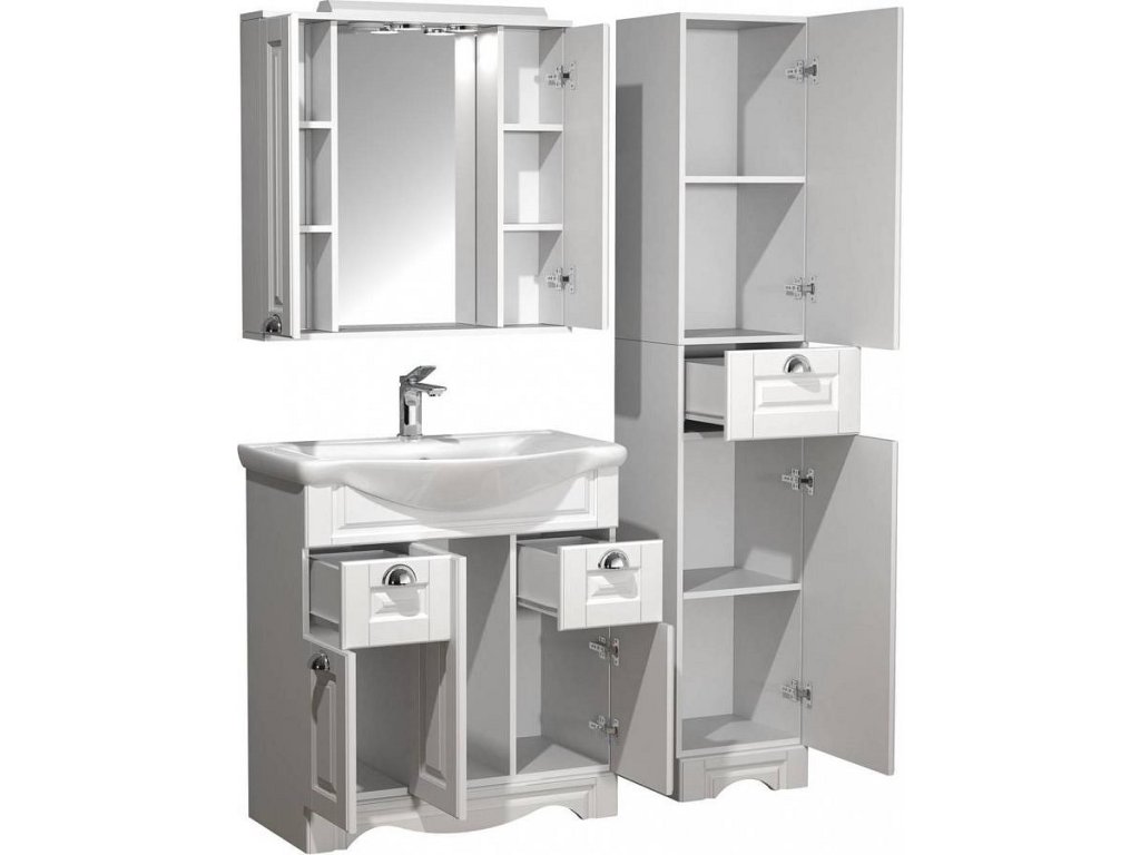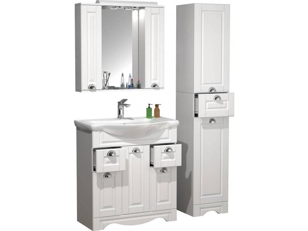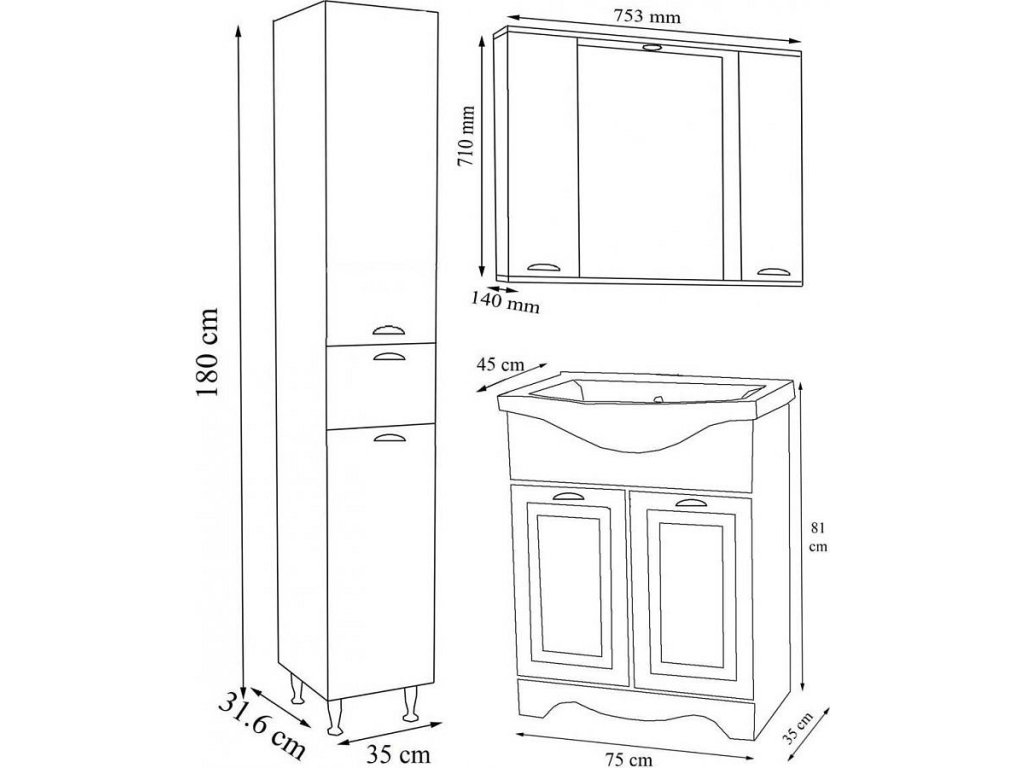 Sada se skládá z: - 1x spodní skříňky se třemi otočnými dvířky a dvěma zásuvkami ve venkovském stylu - 1x keramického umyvadla - 1x zrcadlové skříňky - 1x vysoké skříňky. Koupelnová sada VCM "Casalo" se skládá ze skříňky pod umyvadlo a umyvadla z masivní keramiky, dále ze zrcadlové skříňky a vysoké skříňky. Designérovi se podařilo vytvořit osobitý vzhled ve venkovském stylu, který promění každou koupelnu v harmonickou oázu pohody. Skříňka pod umyvadlo: - Rozměry v. 81 x š. 75 x h. 45 cm - Korpus s robustním a odolným melaminovým povlakem - Tři otočné dvířka a dvě zásuvky ve venkovském stylu Umyvadlo: - Rozměry Š. 75 x H. 45 cm - Vyrobeno z robustní keramiky Rozměry zrcadlové skříňky: - V. 71 x Š. 61 x H. 14 cm - Korpus s robustním a odolným melaminovým povlakem - Dvoje otočné dvířka ve venkovském stylu Rozměry vysoké skříňky: - V. 180 x š. 35 x h. 32 cm - Korpus s robustním a odolným melaminovým povlakem - Dvoje otočné dveře a jedna zásuvka ve venkovském stylu Koupelnovou sestavu lze doplnit dalším koupelnovým nábytkem ze série „Casalo“. VCM se specializuje na design, výrobu a distribuci nábytku s férovým poměrem cena/výkon již od 70. let 20. století a vyzdobila jím miliony domácností.