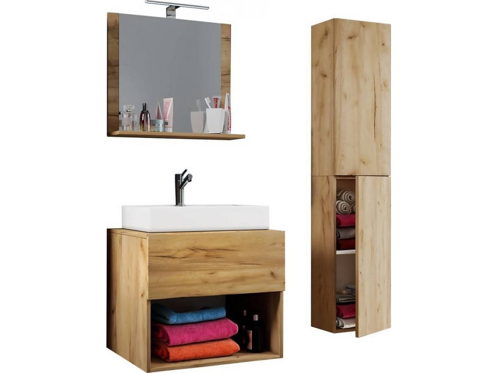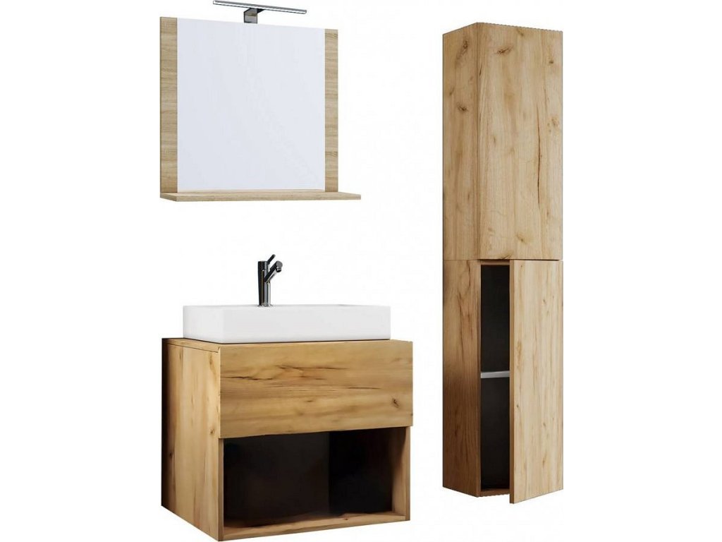 4dílná umyvadlová skříňka Lendas II 60 cm včetně zrcadla a vysoké skříňky, dub medový