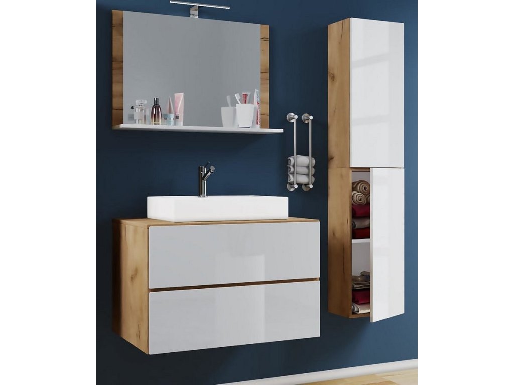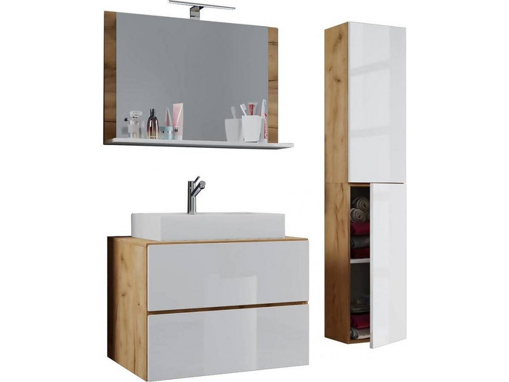 4dílná umyvadlová skříňka Lendas M 80 cm se zrcadlem a vysokou skříňkou, dub medový