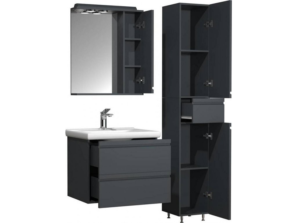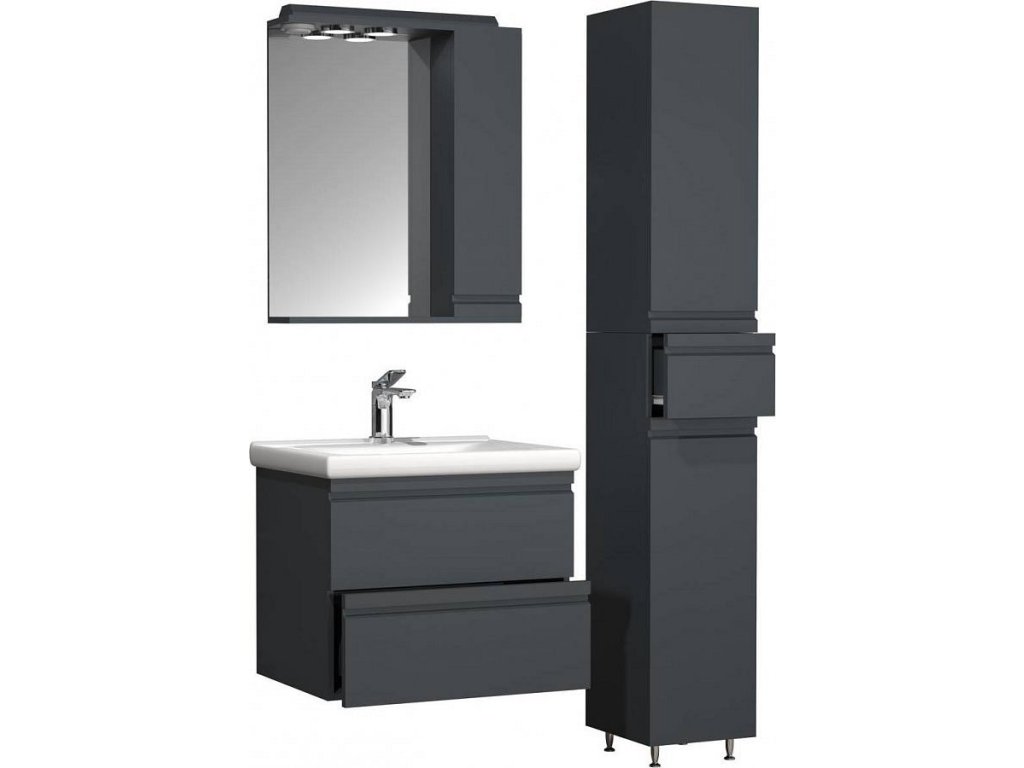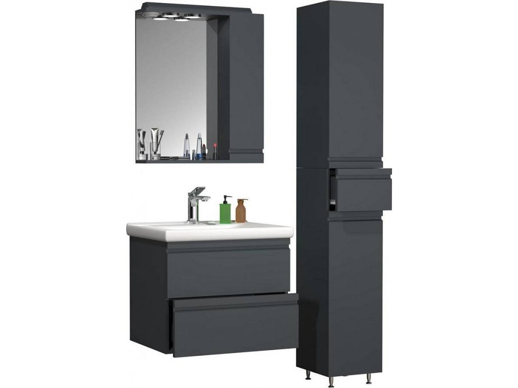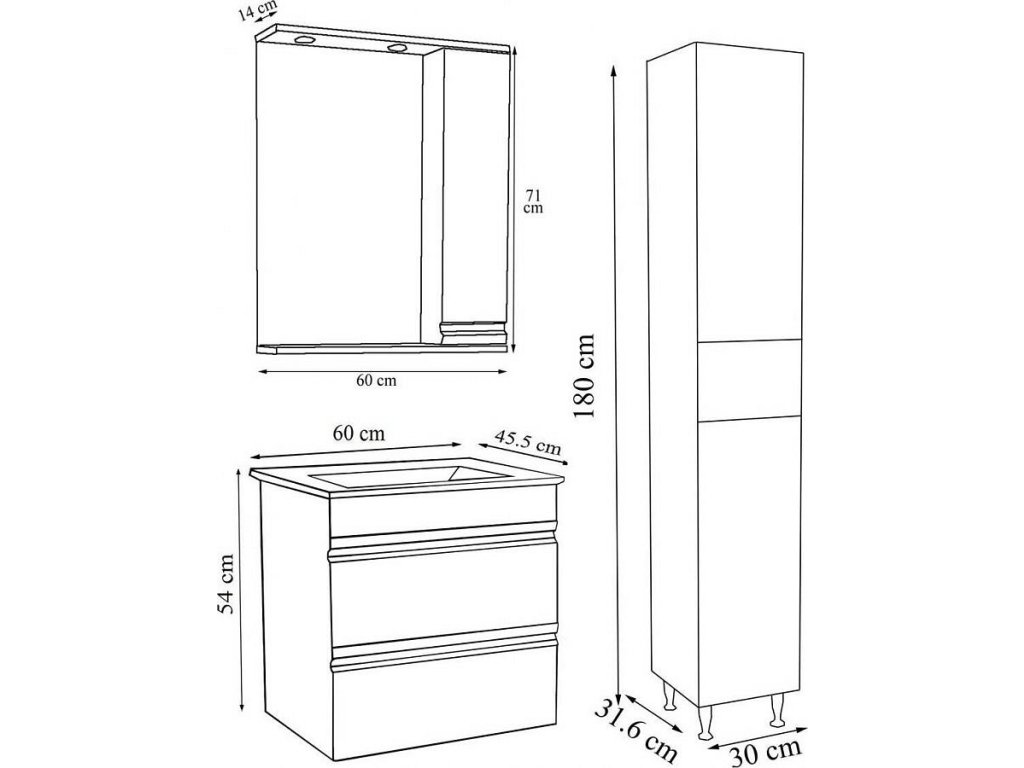 Sada obsahuje: - 1x skříňka pod umyvadlo se dvěma zásuvkami - 1x keramické umyvadlo - 1x zrcadlová skříňka - 1x vysoká skříňka. Koupelnová sada VCM "Silora" se skládá ze spodní skříňky se dvěma zásuvkami a umyvadlem z masivní keramiky, zrcadlové skříňky a vysoké skříňky. Designér záměrně zvolil bezúchytková čela, aby nábytek nadčasově splynul s okolím. Skříňka pod umyvadlo: - Rozměry V 54 x Š 60 x H 46 cm - Korpus s robustním a odolným melaminovým povlakem - Dvě bezúchytkové zásuvky Umyvadlo: - Rozměry Š 60 x H 46 cm - Vyrobeno z robustní keramiky Zrcadlová skříňka: - Rozměry V 71 x Š 60 x H 14 cm - Korpus s robustním a odolným melaminovým povlakem - Jedny výklopné dveře Vysoká skříňka: - Rozměry V 180 x Š 30 x H. 32 cm - Korpus s robustním a odolným melaminovým povlakem - Dvoje otočné dveře a jedna zásuvka Koupelnovou sestavu lze doplnit dalším koupelnovým nábytkem ze série „Silora“. VCM se specializuje na návrh, výrobu a distribuci nábytku s férovým poměrem cena/výkon již od 70. let 20. století a vyzdobila jím miliony domácností.