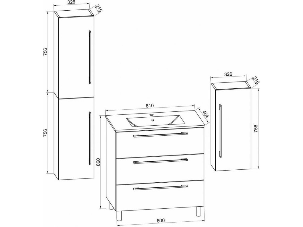 5dílná stojící umyvadlová skříňka Badinos 3 zásuvky 80 cm se zrcadlem, střední a vysokou skříňkou, bílá