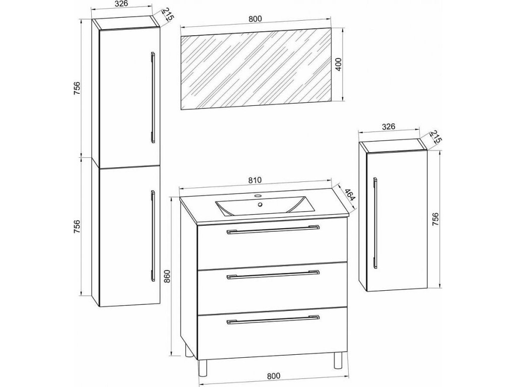 5dílná stojící umyvadlová skříňka Badinos 3 zásuvky 80 cm se zrcadlem, střední a vysokou skříňkou, černá