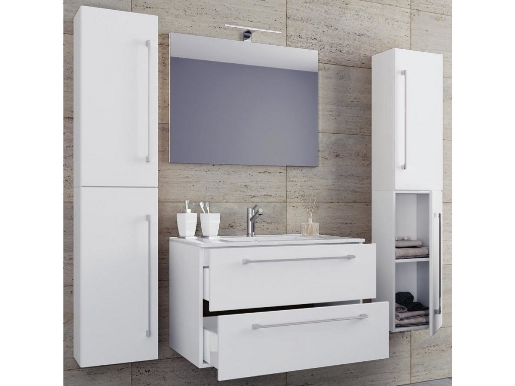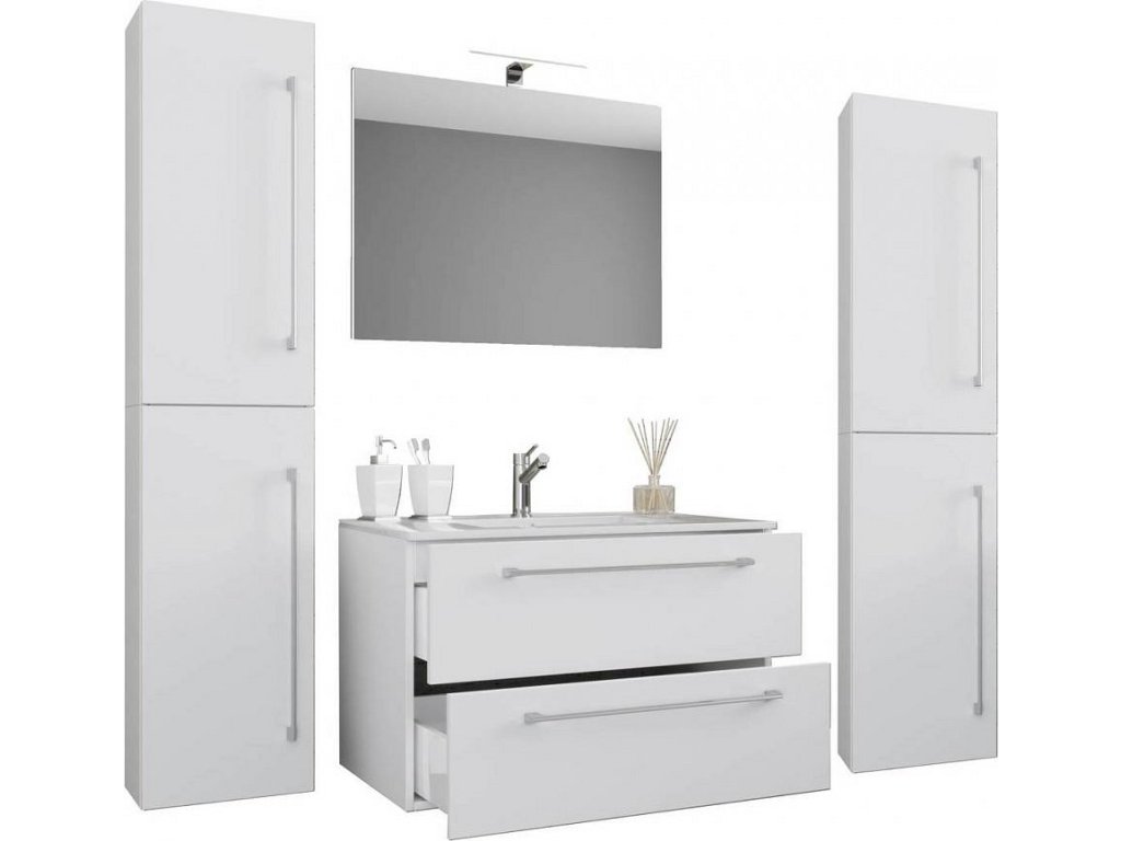 5dílná umyvadlová skříňka Badinos 2 zásuvky 60 cm se zrcadlem a 2 vysokými skříňkami, bílá