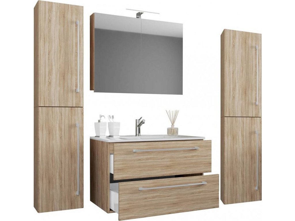 5dílná umyvadlová skříňka Badinos 2 zásuvky 60 cm se zrcadlem a 2 vysokými skříňkami, dub Sonoma