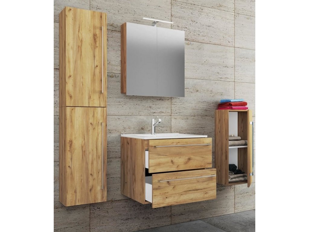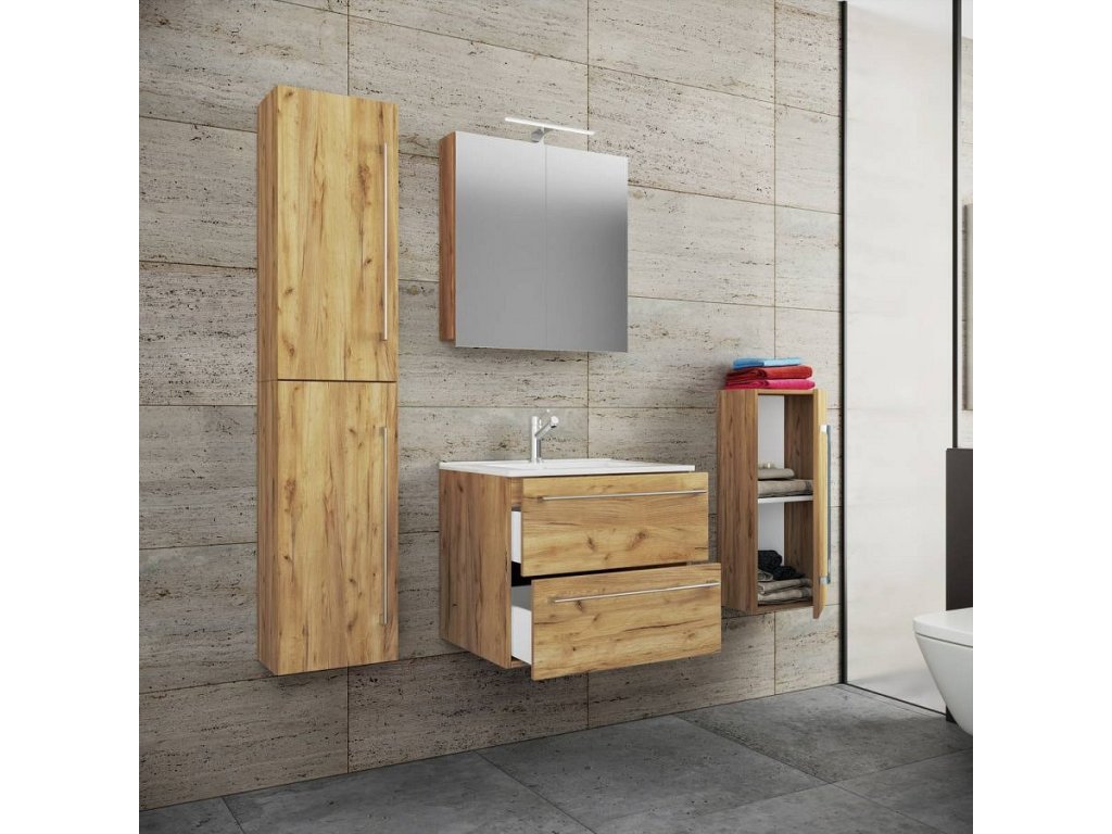 5dílná umyvadlová skříňka Badinos 2 zásuvky 60 cm se zrcadlem a střední/vysokou skříňkou, dub medový