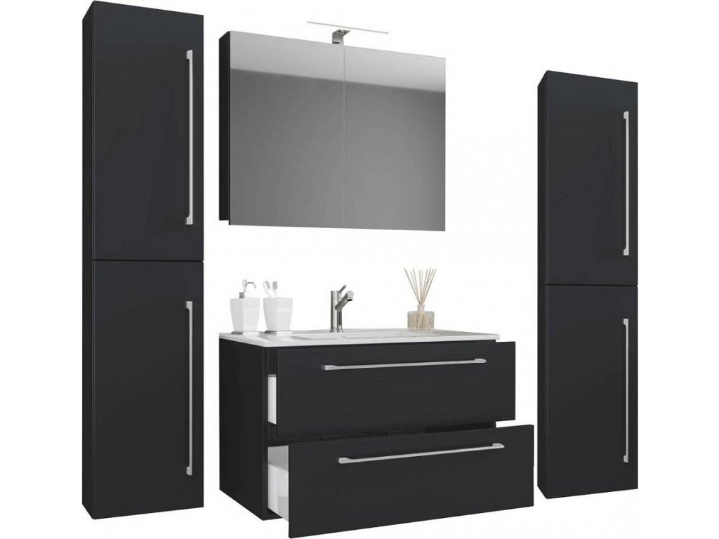 5dílná umyvadlová skříňka Badinos 2 zásuvky 80 cm se zrcadlem a 2 vysokými skříňkami, černá