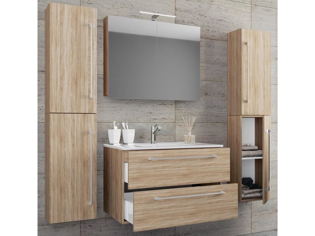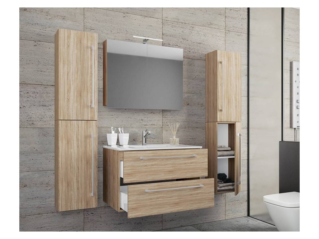 5dílná umyvadlová skříňka Badinos 2 zásuvky 80 cm se zrcadlem a 2 vysokými skříňkami, dub Sonoma