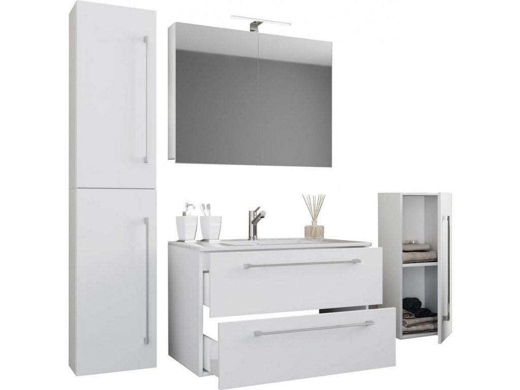 5dílná umyvadlová skříňka Badinos 2 zásuvky 80 cm se zrcadlem a střední/vysokou skříňkou, bílá