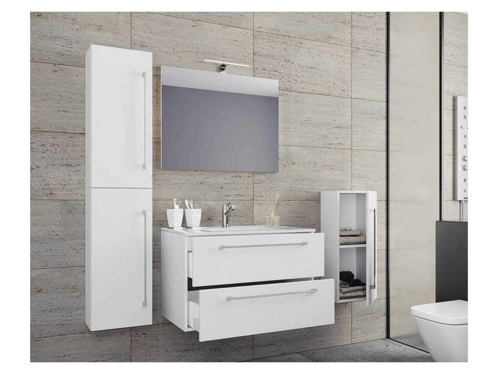 5dílná umyvadlová skříňka Badinos 2 zásuvky 80 cm se zrcadlem a střední/vysokou skříňkou, bílá