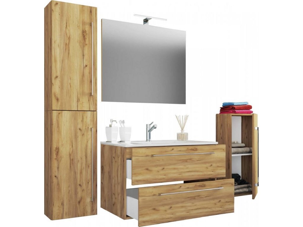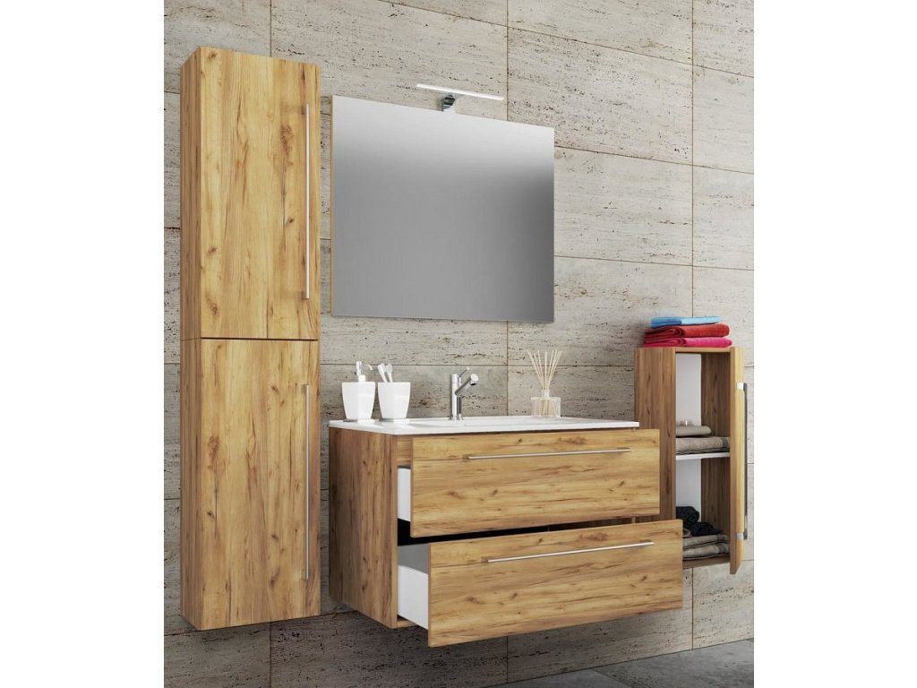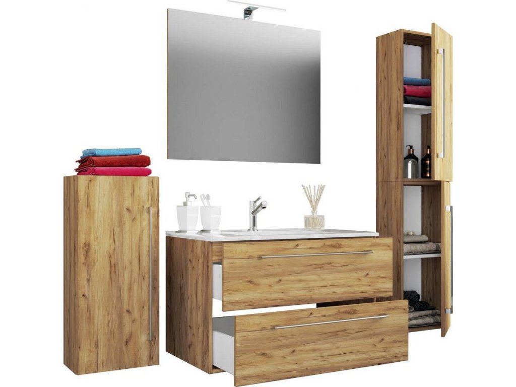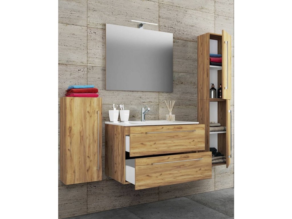 5dílná umyvadlová skříňka Badinos 2 zásuvky 80 cm se zrcadlem a střední/vysokou skříňkou, dub medový
