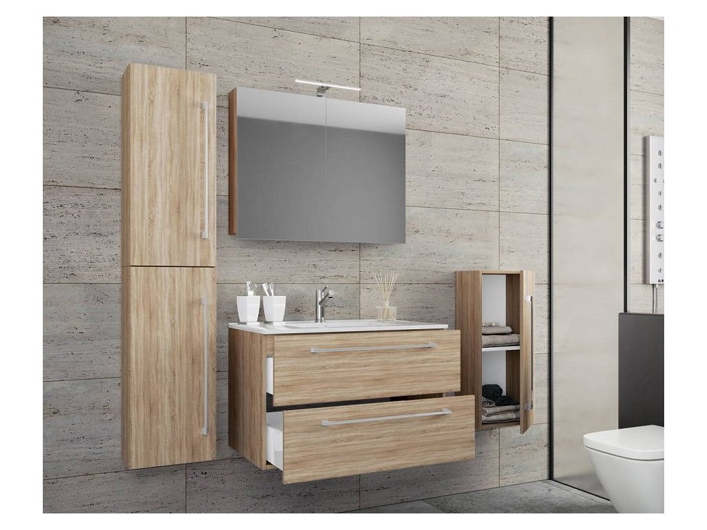 5dílná umyvadlová skříňka Badinos 2 zásuvky 80 cm se zrcadlem a střední/vysokou skříňkou, dub Sonoma