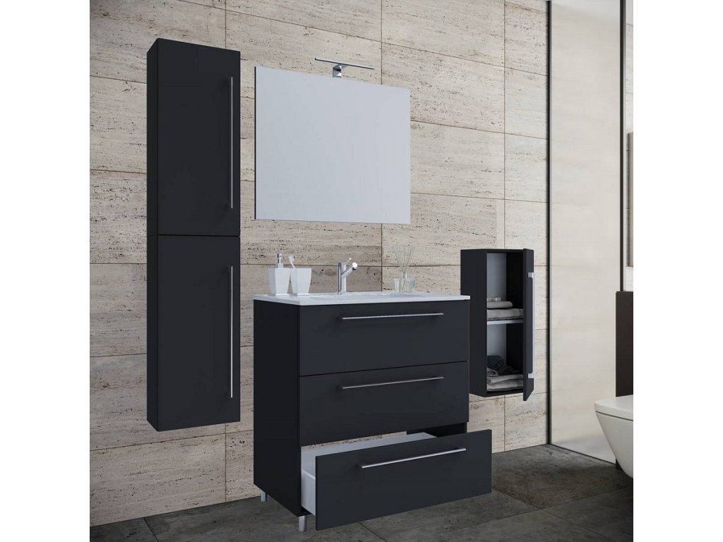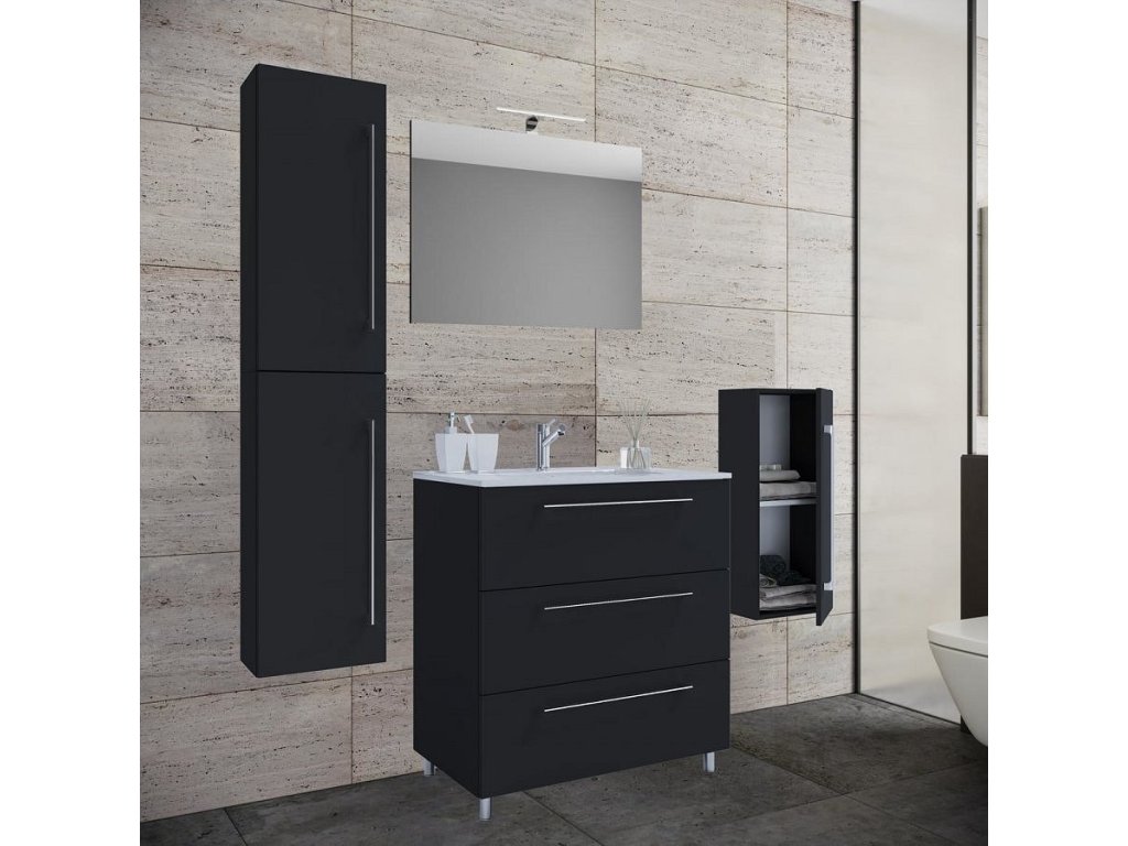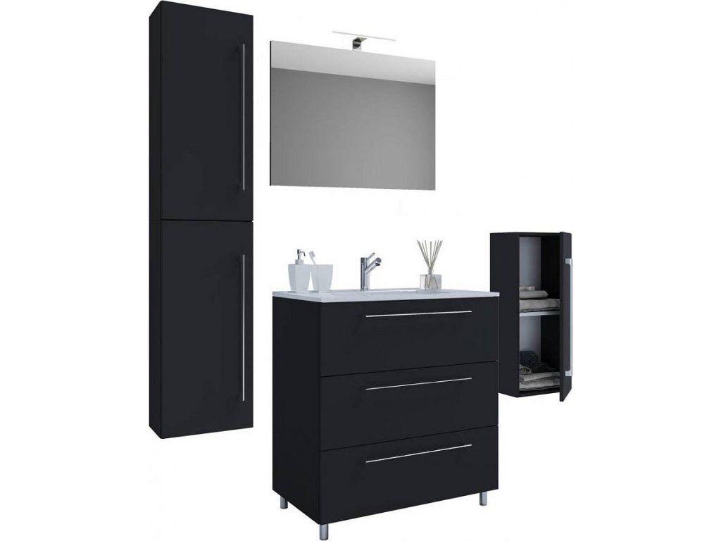 5dílná umyvadlová skříňka Badinos 3 zásuvky 60 cm se zrcadlem, střední a vysokou skříňkou, černá