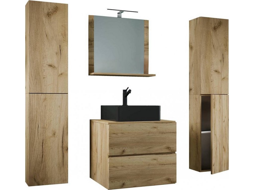 5dílná umyvadlová skříňka Lendas BL XL 60 cm se zrcadlem a 2 vysokými skříňkami, dub medový