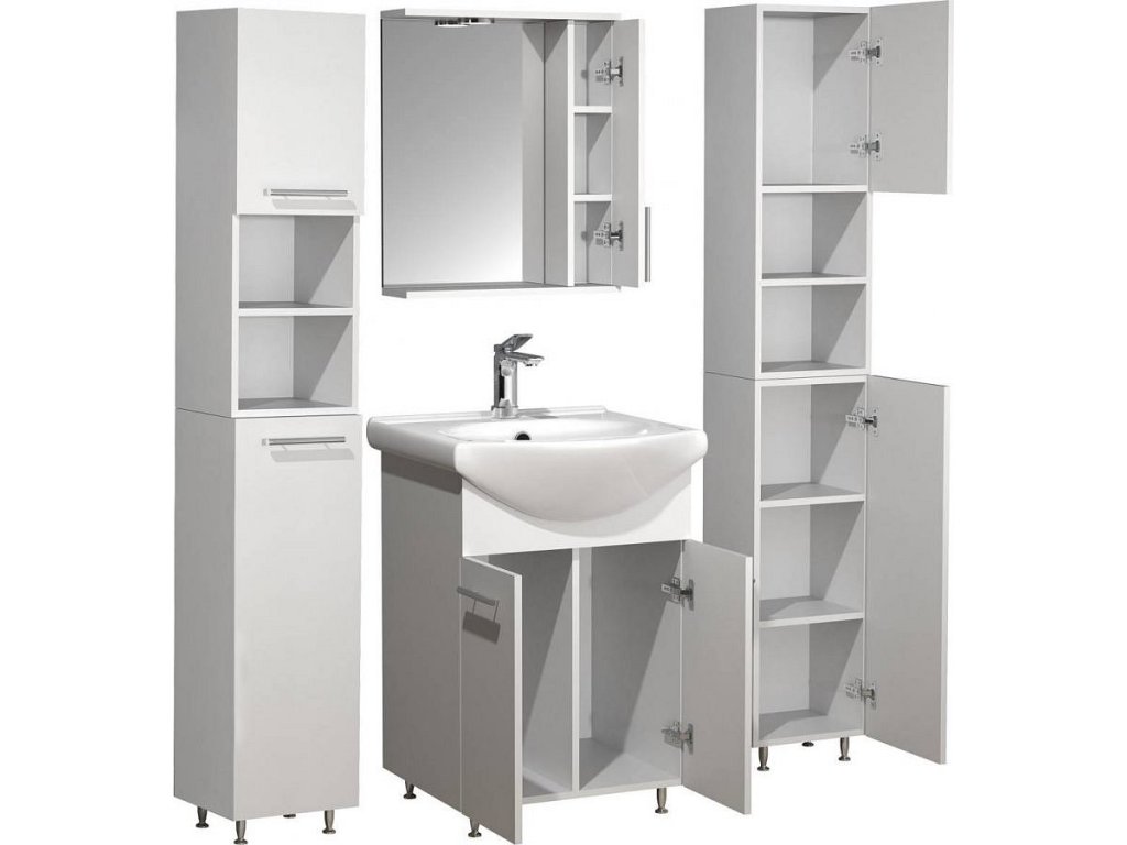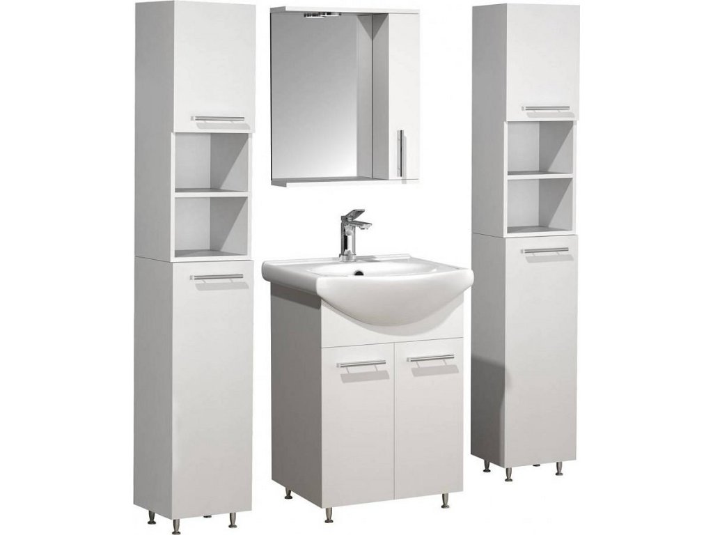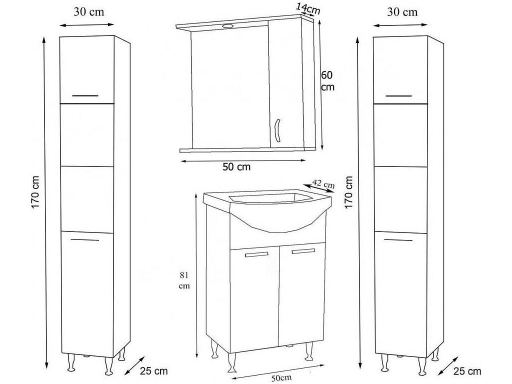 Sada se skládá z: - 1x spodní skříňky se dvěma otočnými dvířky - 1x keramického umyvadla - 1x zrcadlové skříňky s otočnými dvířky - 2x vysoké skříňky se dvěma otočnými dvířky. Koupelnová sada VCM "Lisalo" se skládá ze skříňky pod umyvadlo a umyvadla z masivní keramiky. Designér záměrně zvolil zakřivené umyvadlo, protože zvyšuje komfort. Skříňka pod umyvadlo má dvoje velké otočné dvířka a nabízí praktický úložný prostor. Úložný prostor a otočné dvířka na zrcadle nabízejí další prostor pro dokonalý pořádek v každodenním životě. Sestavu doplňují dvě vysoké skříňky, každá se dvěma dalšími otočnými dvířky a dvěma otevřenými přihrádkami. Skříňka pod umyvadlo: - Rozměry V 81 x Š 50 x H 42 cm - Korpus s robustním a odolným melaminovým povlakem - Dvoje otočné dvířka Zrcadlová skříňka: - Rozměry V 60 x Š 50 x H 14 cm - Korpus s robustním a odolným melaminovým povlakem - Jedny otočné dvířka a jedna úložná přihrádka Vysoká skříňka: - Rozměry V 170 x Š 30 x H. 25 cm - Korpus s robustním a odolným melaminovým povlakem - Dvoje otočné dveře a dvě otevřené přihrádky v každém Umyvadlo: - Rozměry Š. 55 x H. 45 cm - Vyrobeno z robustní keramiky Koupelnovou sadu lze doplnit dalším koupelnovým nábytkem ze série „Lisalo“. VCM se specializuje na návrh, výrobu a distribuci nábytku s férovým poměrem cena/výkon již od 70. let 20. století a vyzdobila jím miliony domácností.