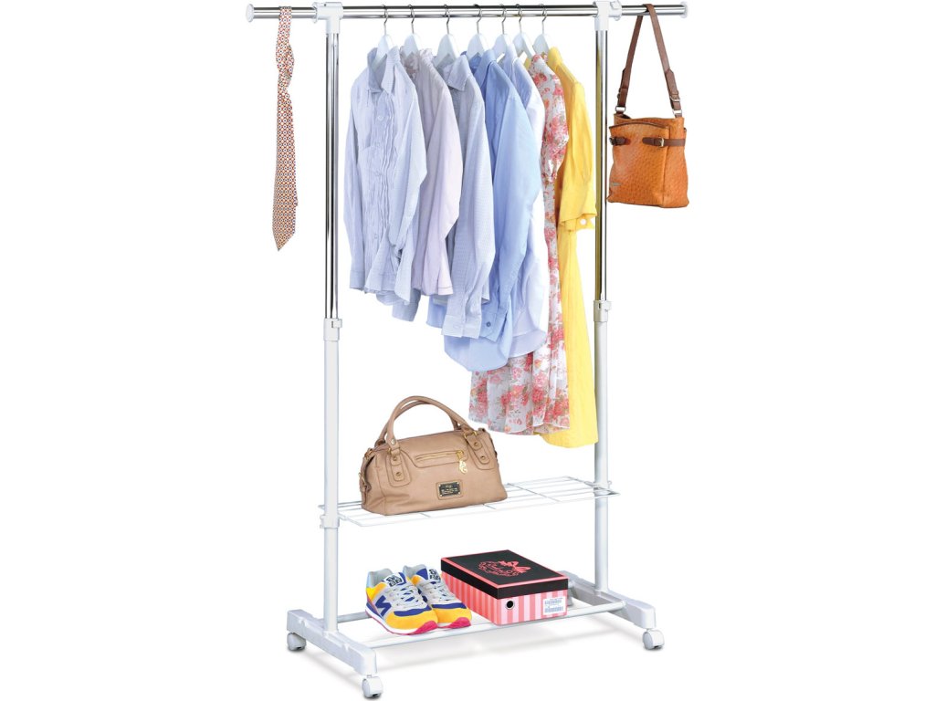 Stojan na šaty s odkladačem a poličkou v bílé barvě kombinuje pevný kovový rám s chromovanými prvky, které dodávají moderní vzhled a odolnost proti opotřebení. Výška stojanu je nastavitelná, což umožňuje přizpůsobit prostor pro zavěšení oděvů různých délek. Praktická spodní polička a odkladač poskytují dostatek místa pro uložení bot, krabic nebo tašek, čímž pomáhají udržet pořádek. Stabilní podstavec je vybaven kolečky pro snadnou manipulaci a přesun v interiéru. Díky kombinaci kovu a plastu je stojan navržen pro dlouhou životnost a snadnou údržbu.