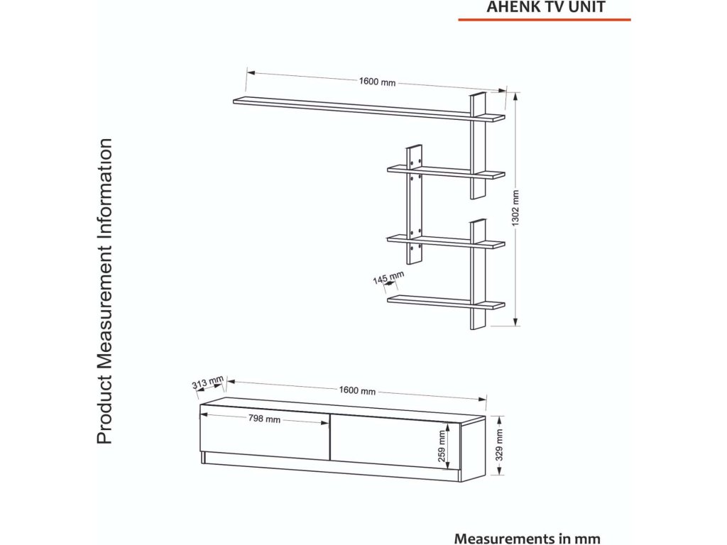 - Rozměry: TV stolek (160 x 31.3 x 32.9 cm) a nástěnná police (160 x 14.5 x 130.2 cm) poskytují efektivní prostor pro uskladnění vaší elektroniky a zároveň slouží jako estetický prvek v místnosti.