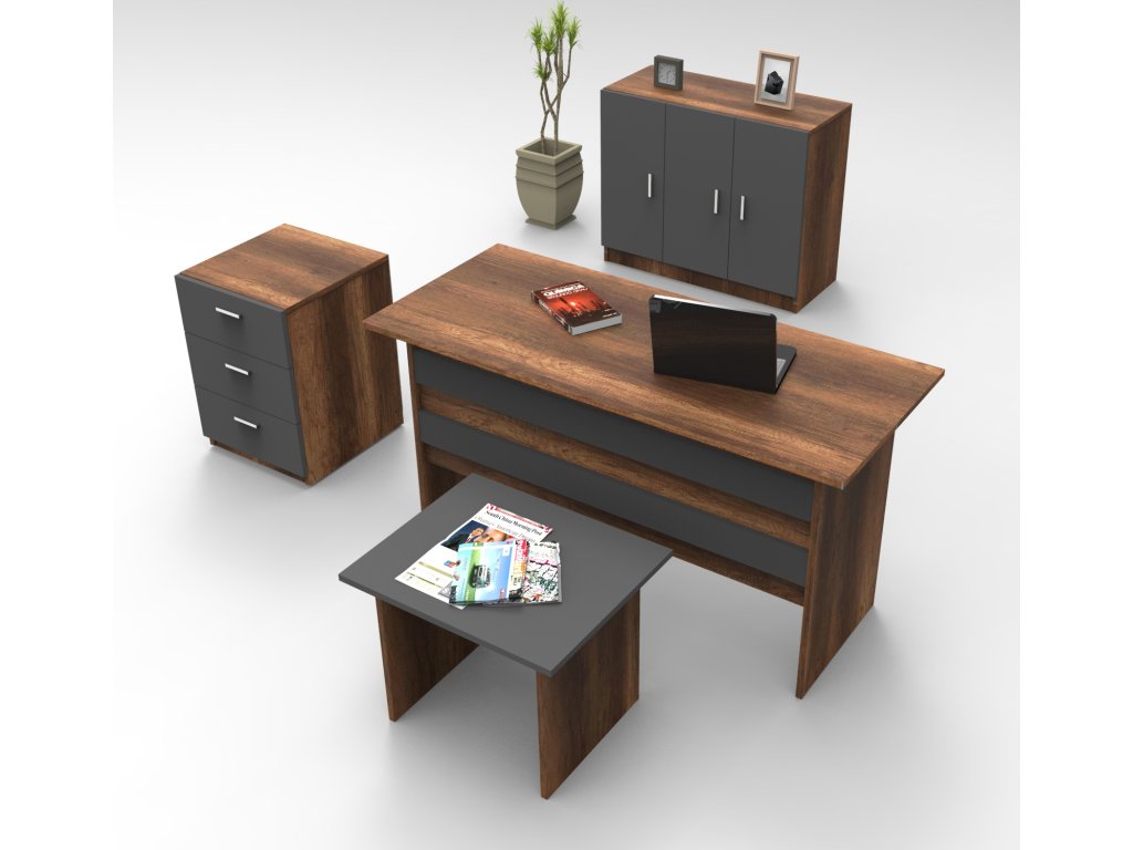 kombinuje funkčnost a moderní styl. Psací stůl poskytuje komfortní prostor pro práci, konferenční stolek je ideální pro schůzky nebo odkládání dokumentů, malá komoda nabízí praktické úložné řešení a větší komoda poskytuje dostatek místa na šanony, knihy nebo pracovní pomůcky.