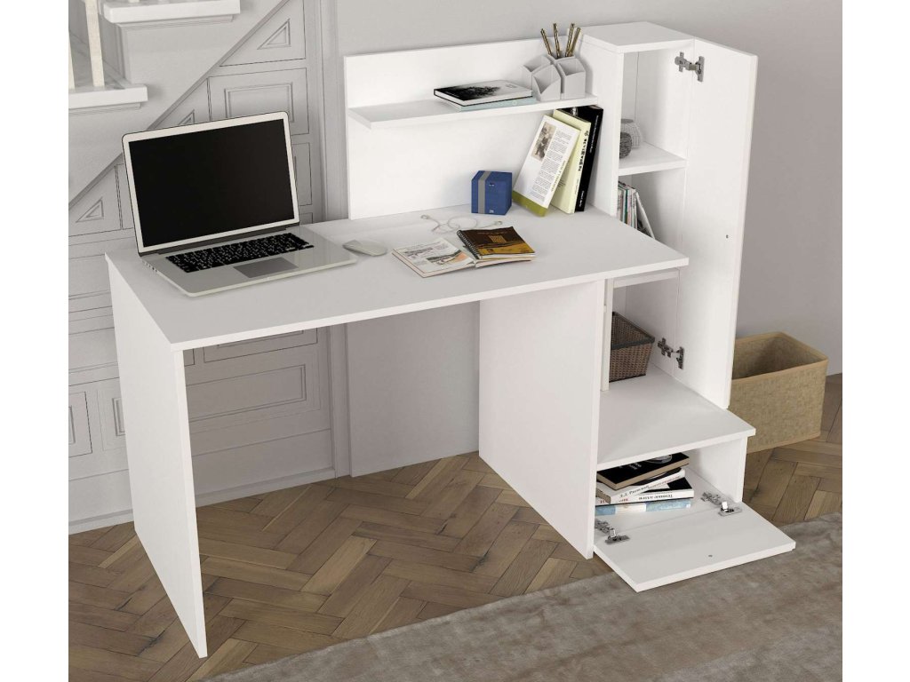 Písací stůl je vyroben z kvalitního LTD materiálu s tloušťkou 18 mm, což zajišťuje jeho pevnost a dlouhou životnost. Stylový bílý design dodává stolu moderní a čistý vzhled, který se hodí do jakéhokoliv interiéru. Stůl je vybaven praktickým regálkem, který poskytuje dostatek úložného prostoru pro vaše pracovní potřeby a pomůcky.