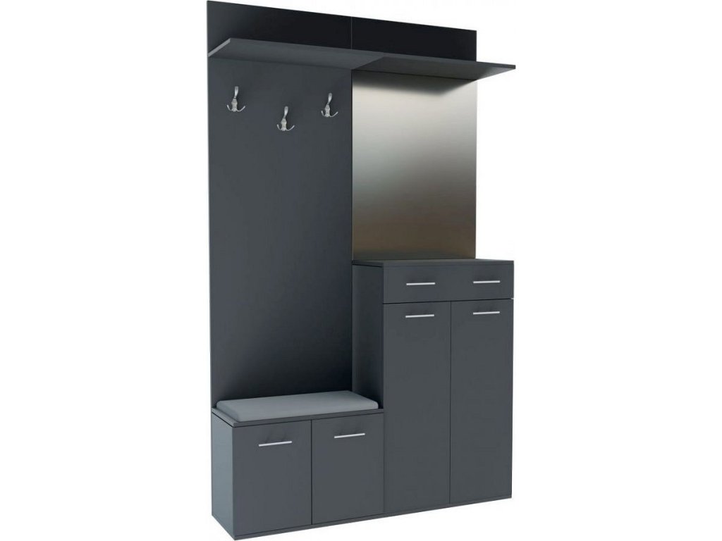 CASA 83001 Předsíňová stěna vyrobená z kvalitní laminátové desky ( zadní panel HDF ) v barevném provedení grafit šedý. Sestava se skládá ( š/v/h ) - panel s věšákem a komodou ( 60 x 200 x 30 cm ) a panel se zrcadlem a botníkem se zásuvkou ( 60 x 200 x 30 ). Další rozměry viz perokresba. Sedací polštářek je v ceně (barevné provedení polštářku se od obrázku může lišit). Dodáváme v demontovaném stavu.