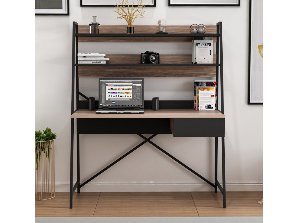 ATHENY pracovní stůl s regálem, ořech / černá