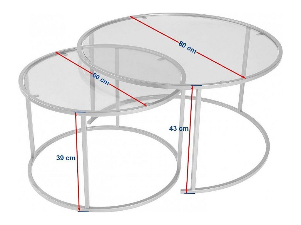 Sada obsahuje malý a velký stůl, oba s elegantním a minimalistickým designem, který doplní jakýkoli styl interiéru. Malý stůl má šířku 60 cm, výšku 39 cm a hloubku 60 cm, zatímco velký stůl má šířku 80 cm, výšku 43 cm a hloubku 80 cm.