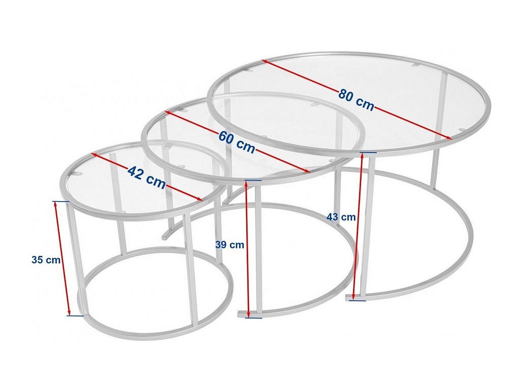 - Střední stůl: Šířka: 60 cm, Výška: 39 cm, Hloubka: 60 cm