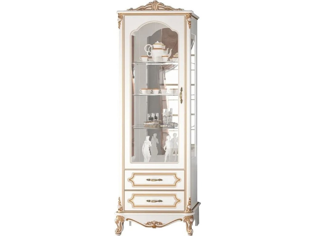 Pevné ozdobné nožičky dodávají nábytku stabilitu. Obsahuje prosklené dvířka a 2 zásuvky.