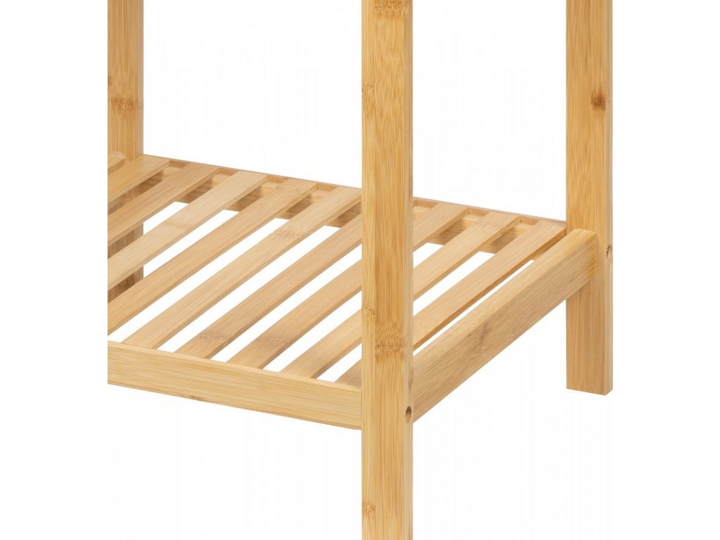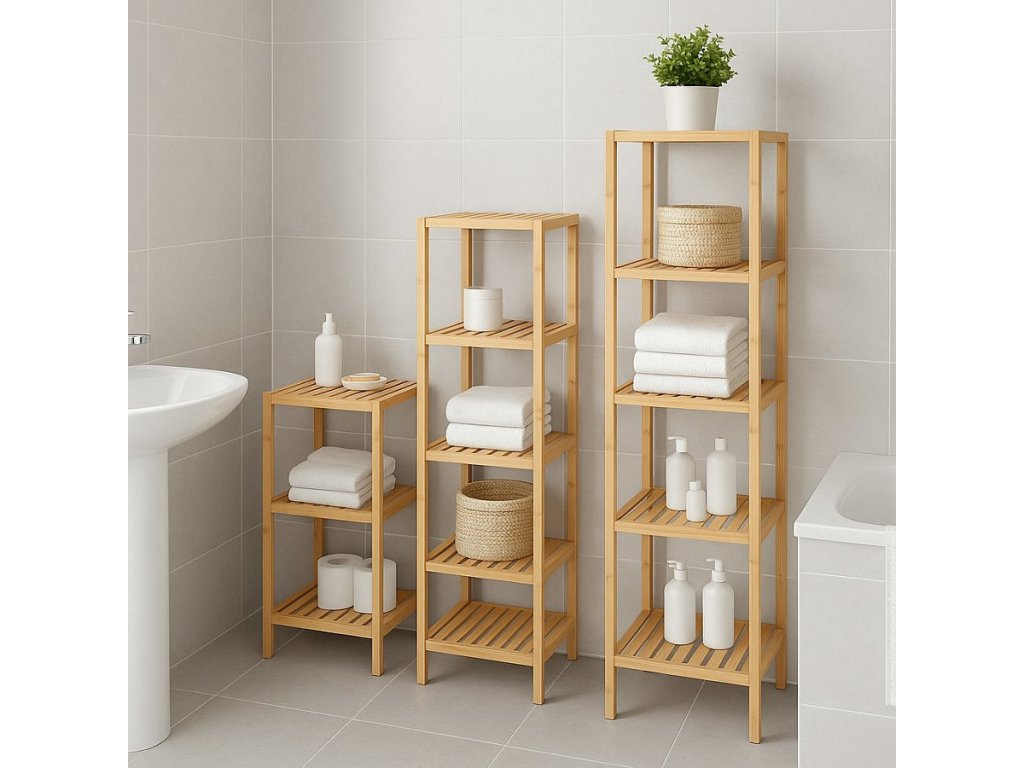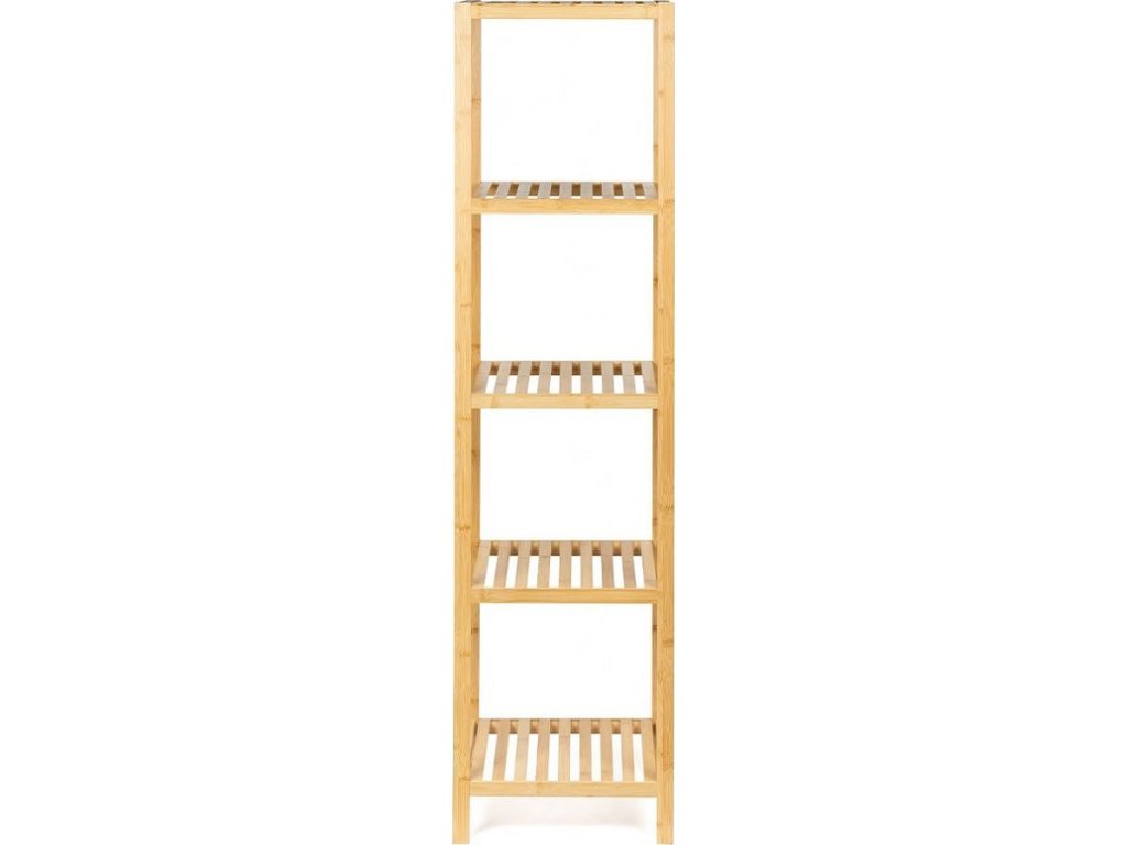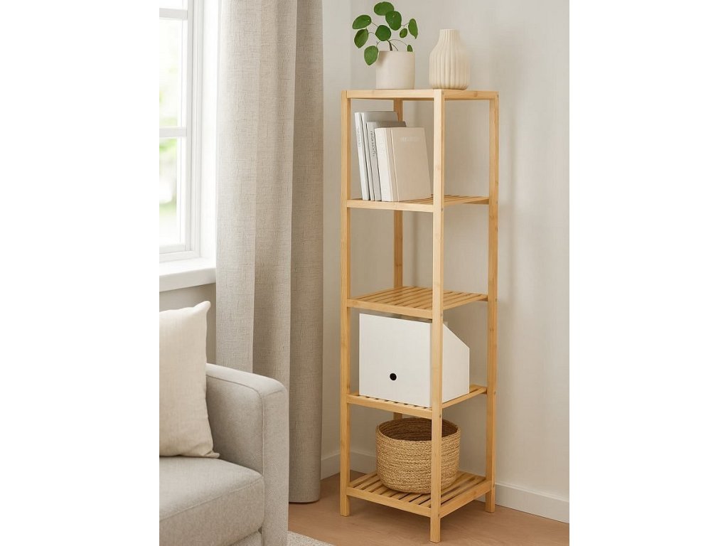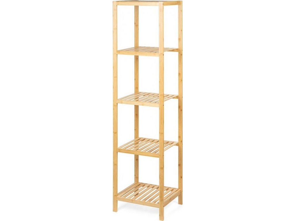 Praktický policový díl s pěti úložnými policemi. Vyroben z odolného bambusu, který je pevný a ekologický. Otevřená konstrukce umožňuje snadný přístup k uloženým věcem. Všestranné využití v koupelně, kuchyni, předsíni nebo ložnici. Jednoduchý a přirozený design, který se hodí do různých interiérů.