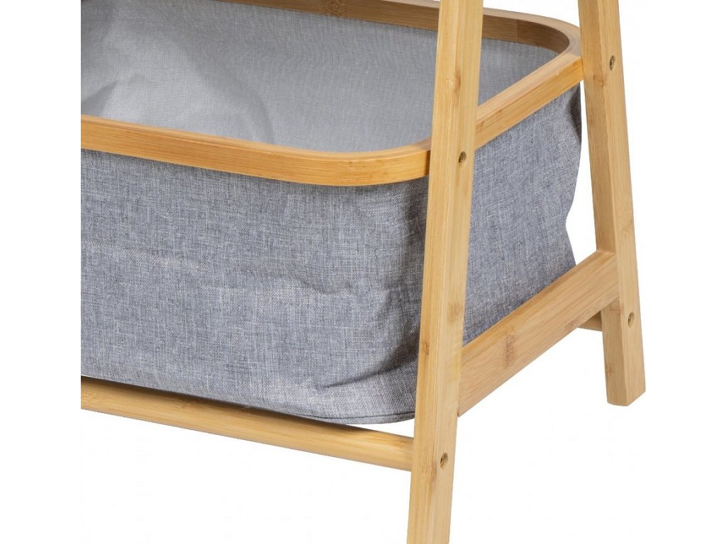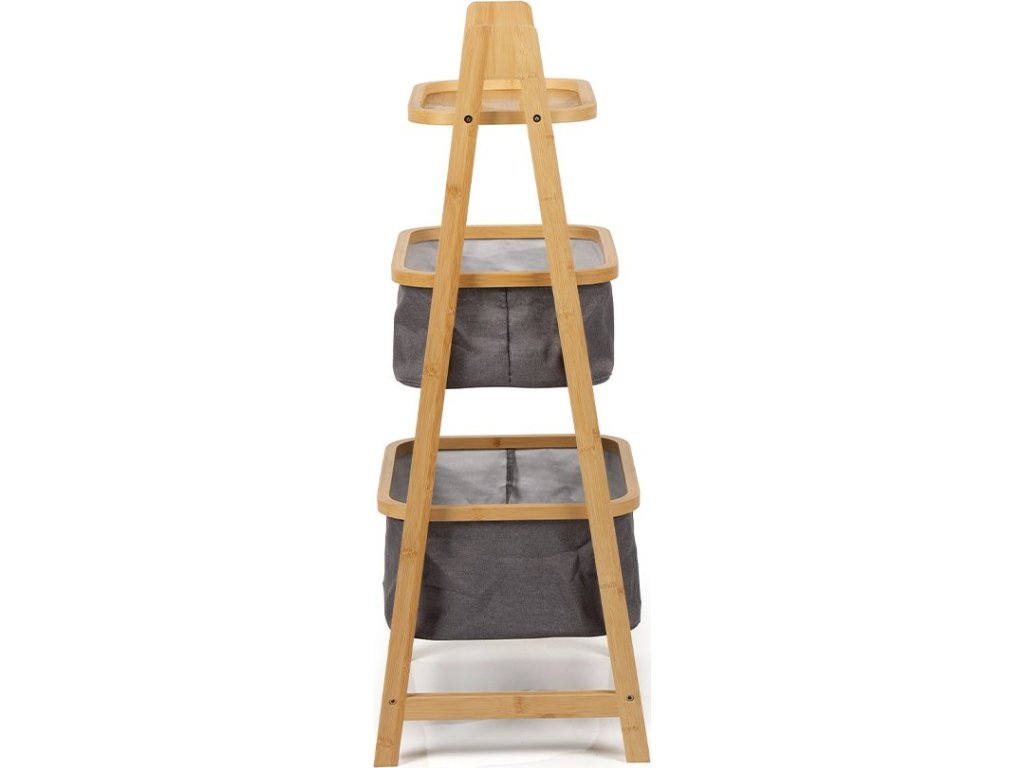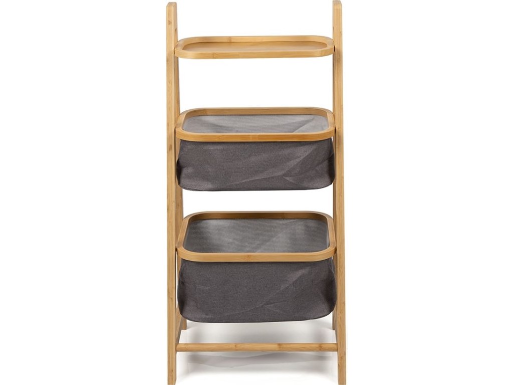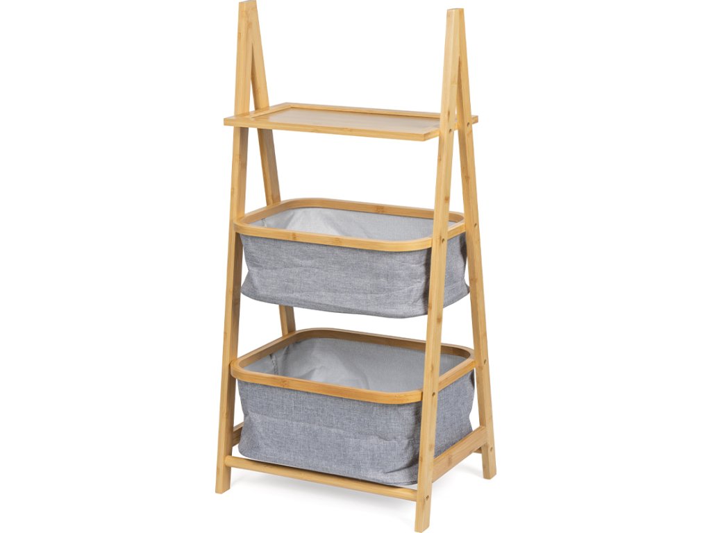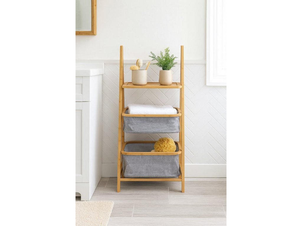 Policový díl s kombinací otevřených polic a úložných košů. Rám z přírodního bambusu pro stabilitu a moderní vzhled. Horní police vhodná na dekorace, či drobnosti. Dvě textilní zásuvky poskytují praktický a skrytý úložný prostor. Všestranné využití v koupelně, ložnici, předsíni či obývacím pokoji. Lehká konstrukce umožňuje snadnou manipulaci.