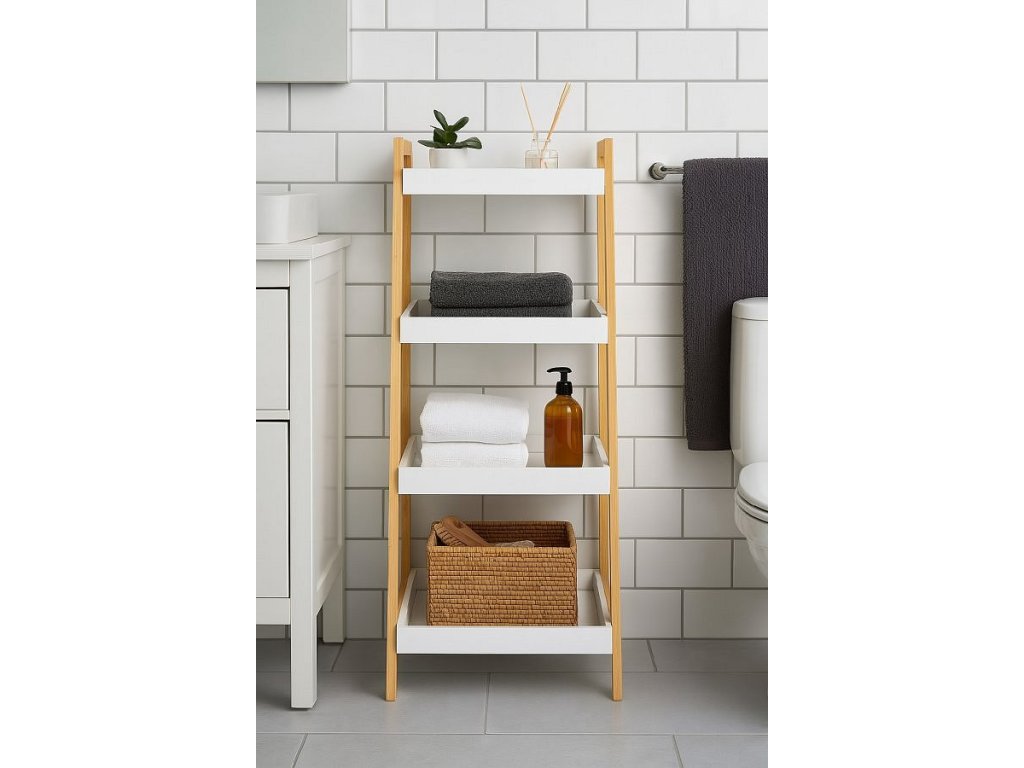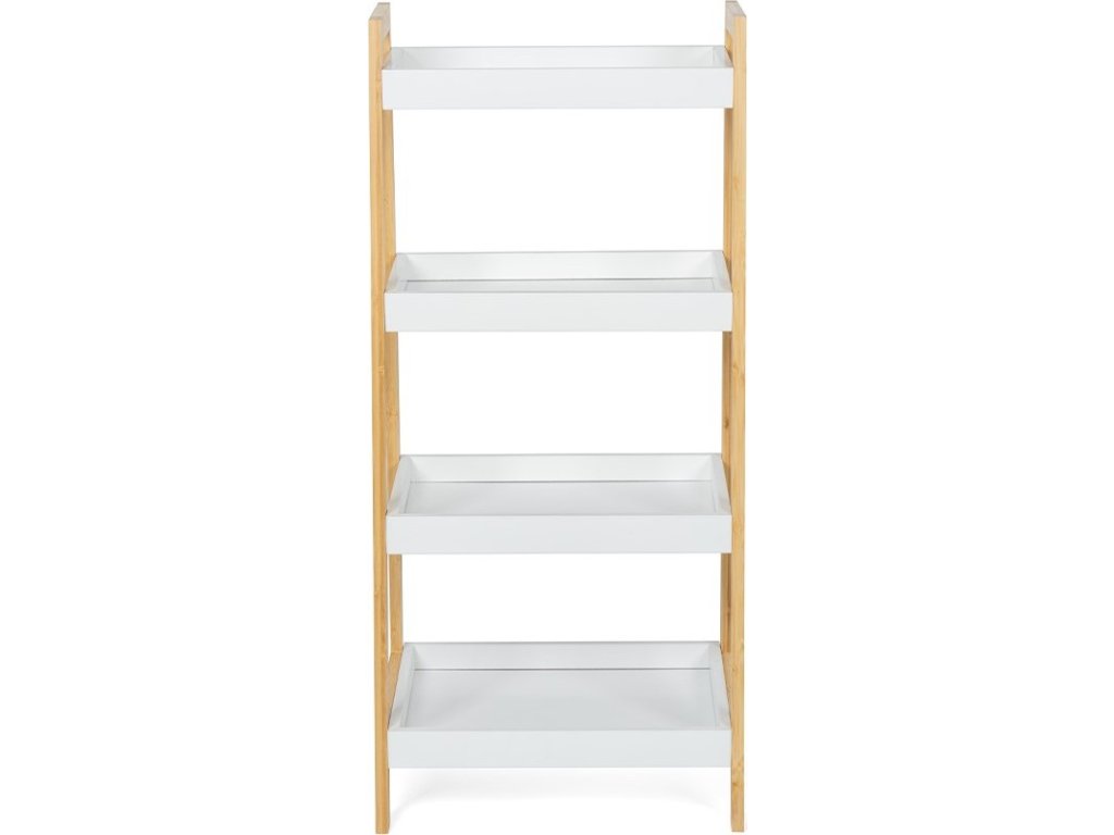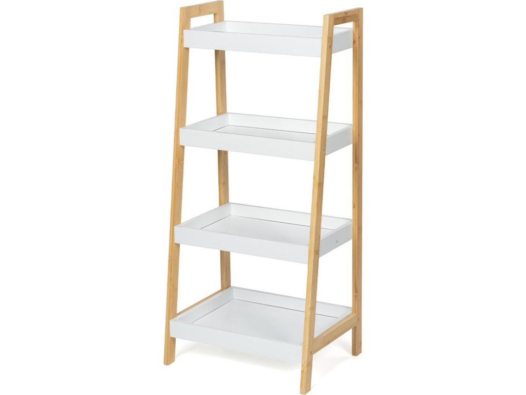 Designový policový díl se čtyřmi hlubšími policemi ve tvaru táců. Rám z přírodního bambusu dodává stabilitu a moderní vzhled. Bílé police s vyvýšenými okraji brání předmětům vypadnutí. Praktické řešení pro uložení dekorací, knih, ručníků nebo rostlin. Díky zkosené konstrukci působí odlehčeně a zapadne do moderních interiérů. Vhodný do obývacího pokoje, koupelny, ložnice i předsíně.
