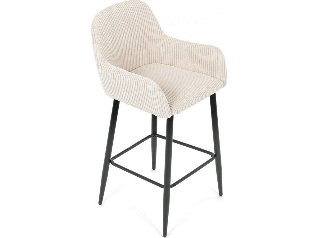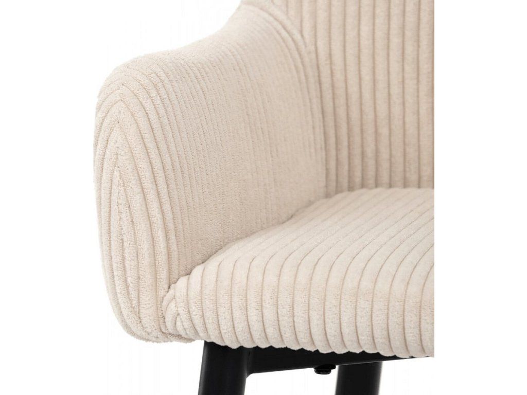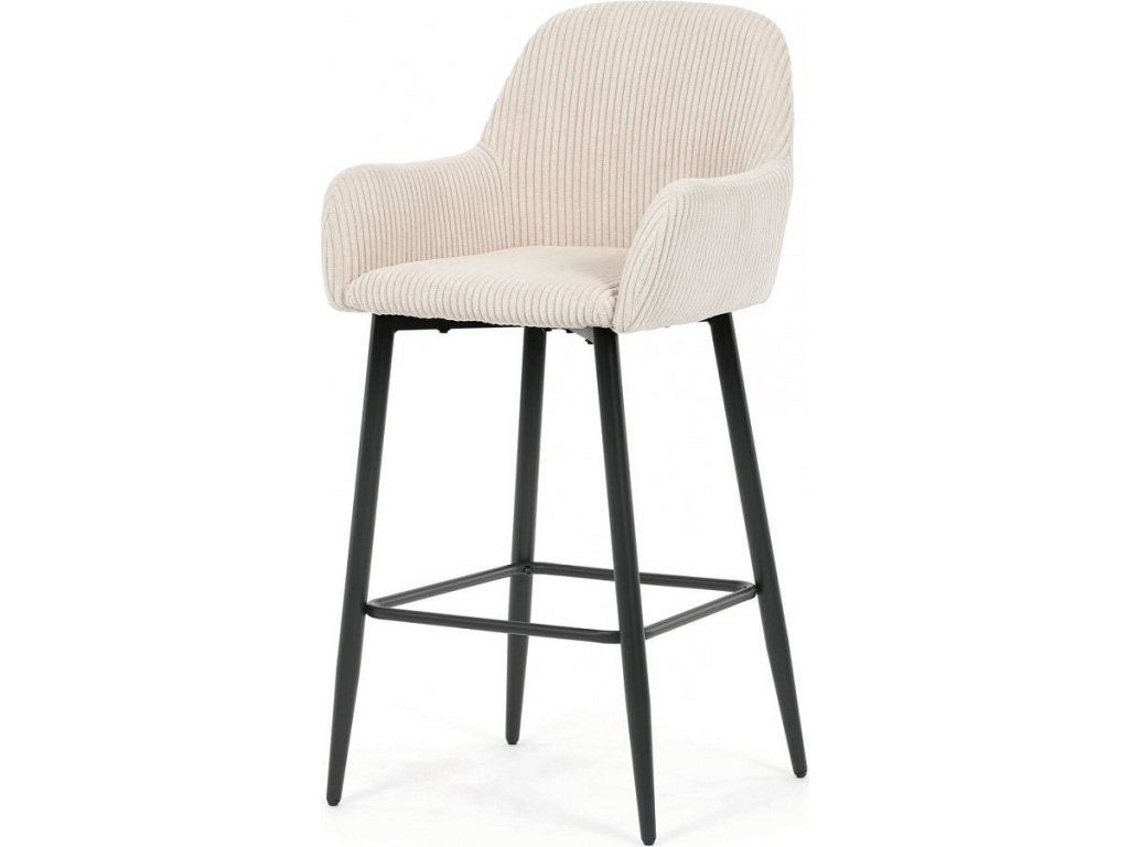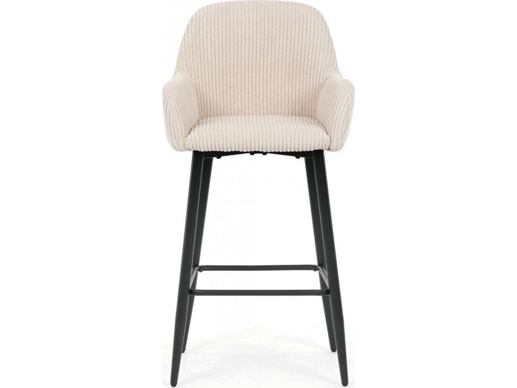 Barová židle s područkami v béžovém manšestrovém potahu kombinuje pohodlí a moderní design. Sedák i opěradlo jsou čalouněné příjemnou manšestrovou látkou, která nabízí měkký povrch s jemnou texturou a snadnou údržbu. Pevné kovové nohy v černém matném provedení zajišťují stabilitu a dlouhou životnost, přičemž spodní příčná výztuha slouží zároveň jako praktická opěrka nohou. Židle není otočná, což podtrhuje její jednoduchý a elegantní tvar vhodný pro bary, kuchyňské ostrůvky či vysoké stoly. Díky ergonomicky tvarovaným područkám poskytuje dostatečnou oporu pro ruce a přispívá k pohodlnému posezení.