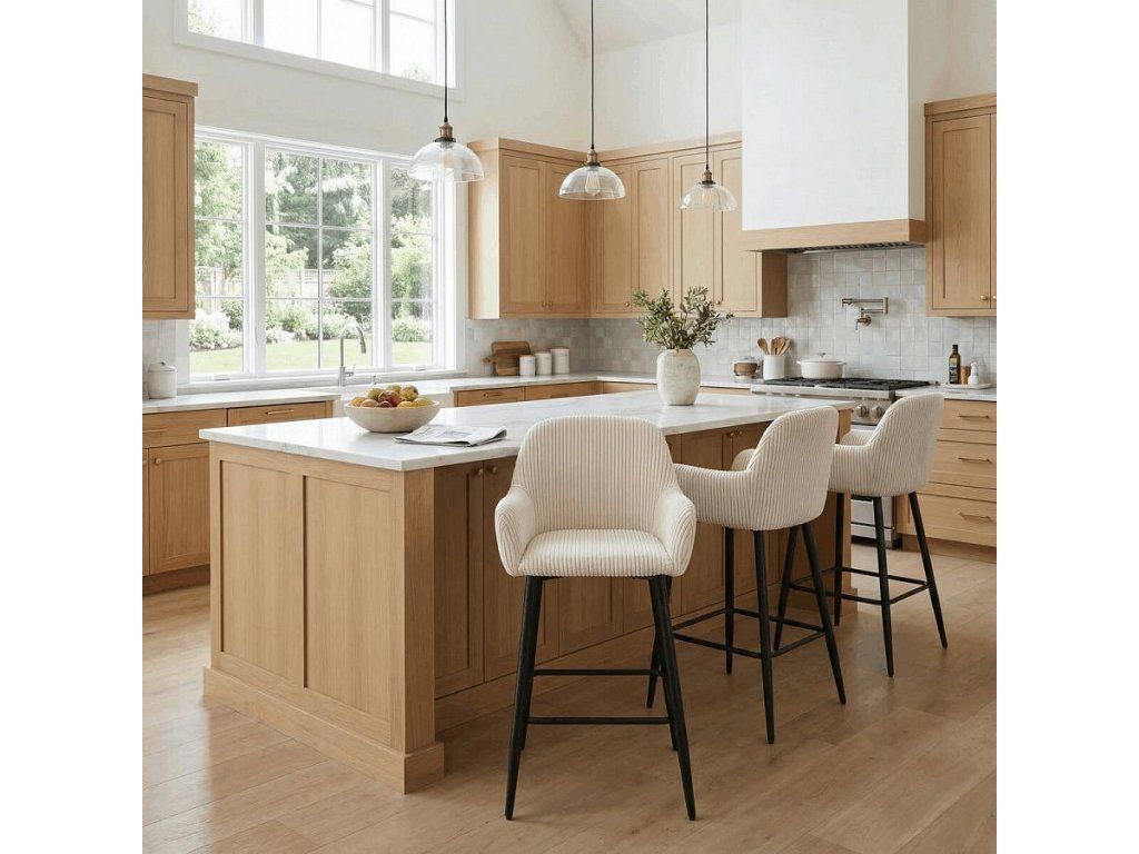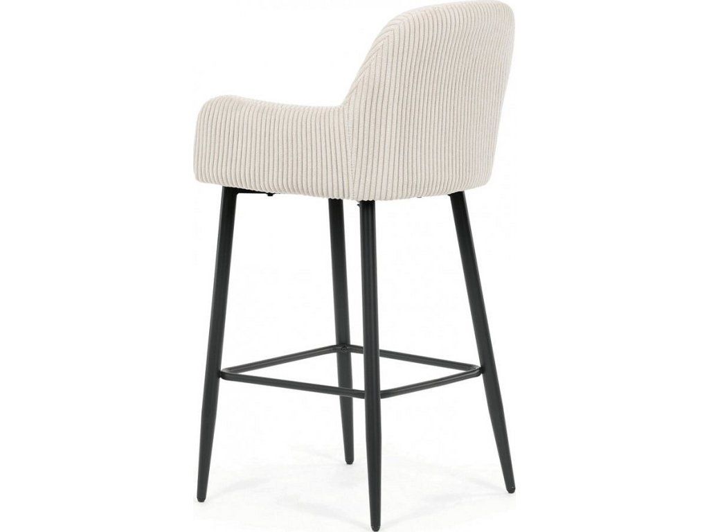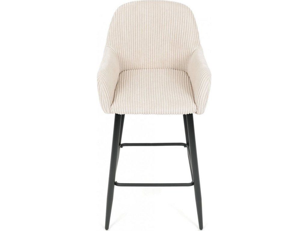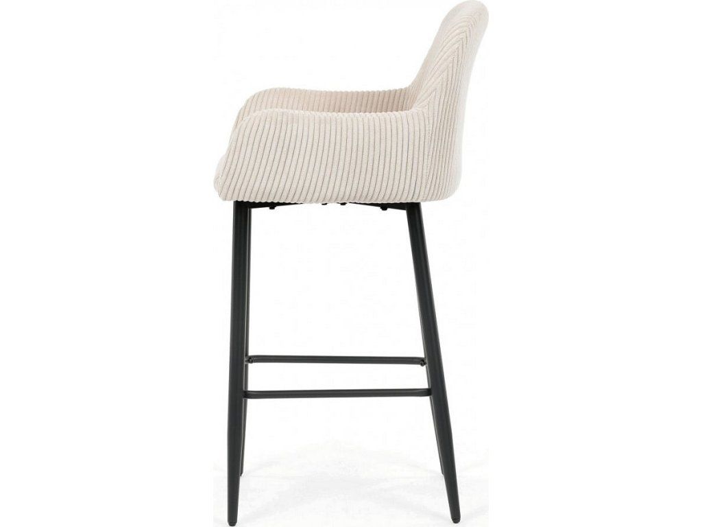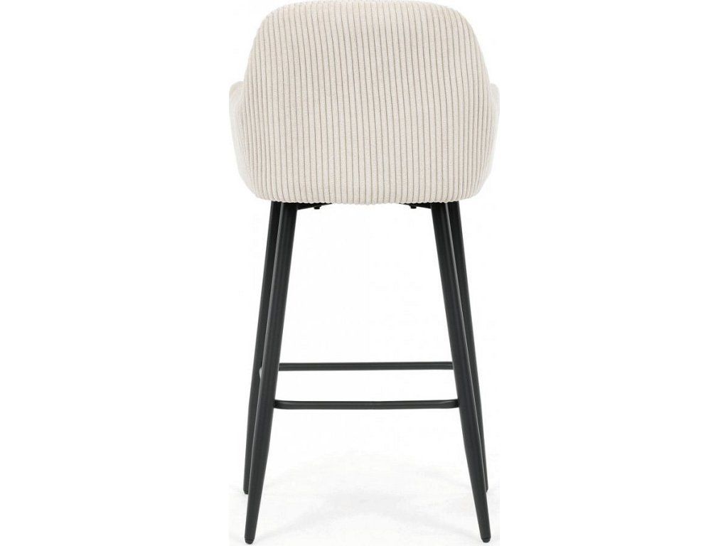 Barová židle s područkami v béžovém manšestrovém potahu kombinuje pohodlí a moderní design. Sedák i opěradlo jsou čalouněné příjemnou manšestrovou látkou, která nabízí měkký povrch s jemnou texturou a snadnou údržbu. Pevné kovové nohy v černém matném provedení zajišťují stabilitu a dlouhou životnost, přičemž spodní příčná výztuha slouží zároveň jako praktická opěrka nohou. Židle není otočná, což podtrhuje její jednoduchý a elegantní tvar vhodný pro bary, kuchyňské ostrůvky či vysoké stoly. Díky ergonomicky tvarovaným područkám poskytuje dostatečnou oporu pro ruce a přispívá k pohodlnému posezení.