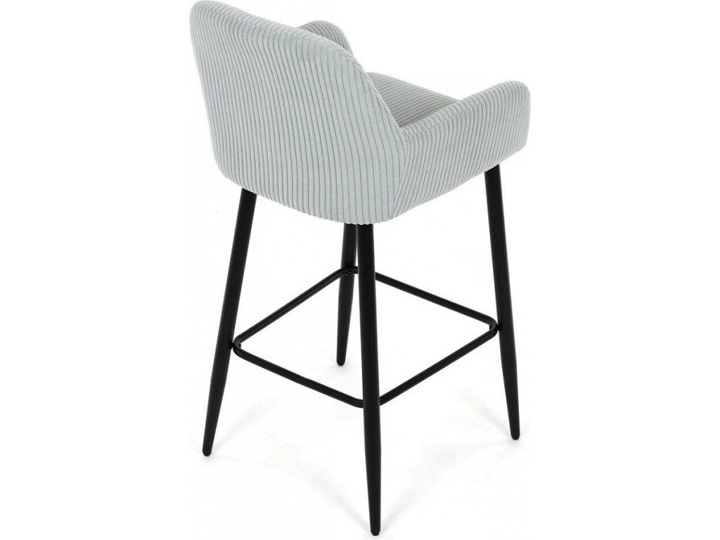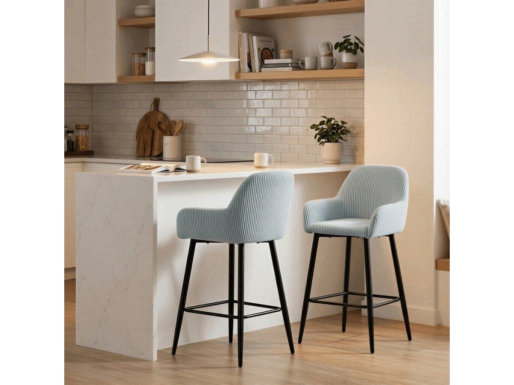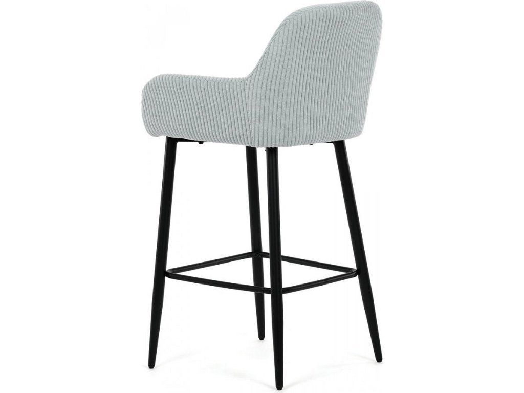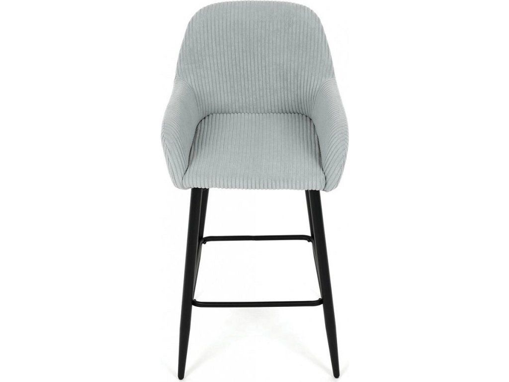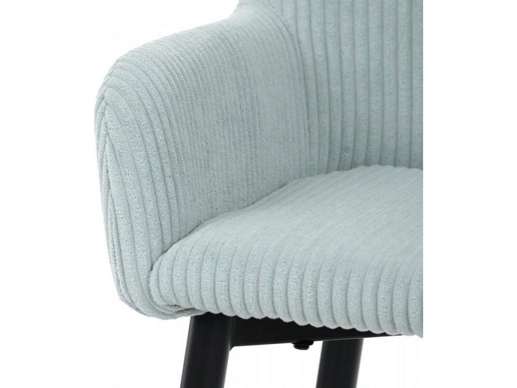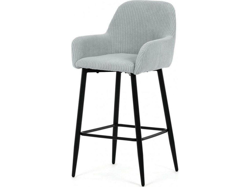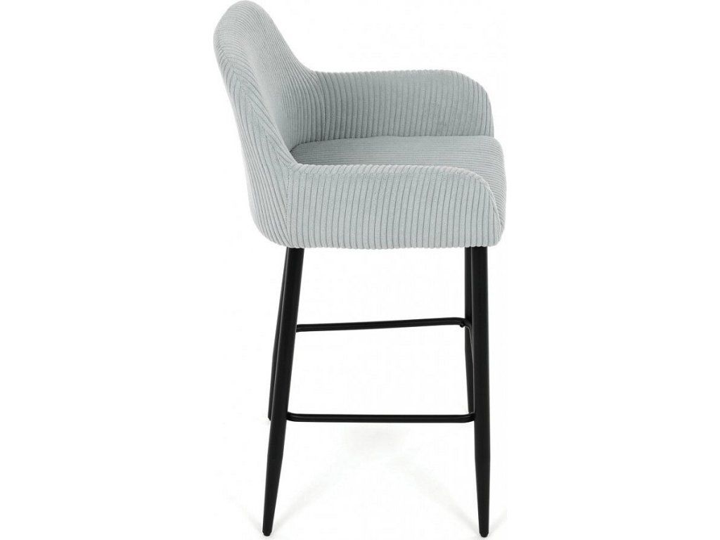Barová židle s područkami v modrém manšestrovém potahu nabízí pohodlné posezení s příjemnou texturou látky, která je navržena pro dlouhou životnost a snadnou údržbu. Pevné černé kovové nohy zajišťují stabilitu a odolnost, přičemž jejich konstrukce obsahuje i praktickou opěrku nohou pro zvýšení komfortu při sezení. Ergonomicky tvarované opěradlo a područky poskytují dostatečnou oporu paží a zad, což přispívá k pohodlnému posezení u barového pultu nebo kuchyňského ostrůvku. Židle není otočná, což podtrhuje její jednoduchý a stabilní design vhodný do moderních i klasických interiérů. Nosnost a rozměry jsou přizpůsobeny běžným požadavkům na barové sezení.