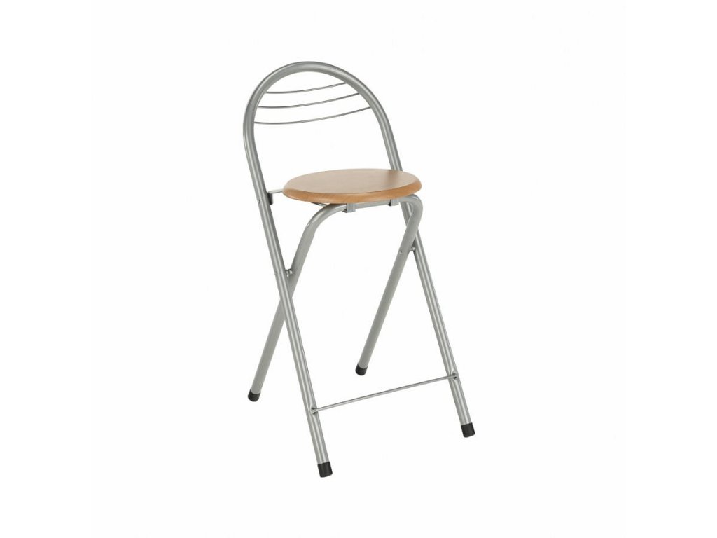 barová židle, kov s povrchovým nátěrem aluminium v kombinaci s dřevem, odstín dřeva buk, průměr 39 cm, výška sedu: 60 cm. Rozměr židle (ŠxHxV): 36x44x80 cm Nosnost židle: 80 kg Dodávané v monte.