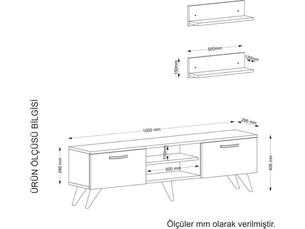 - Rozměry: TV stolek o rozměrech 150 x 30 x 40,6 cm, doplněný dvěma nástěnnými policemi (každá 50 x 12 x 15 cm).
