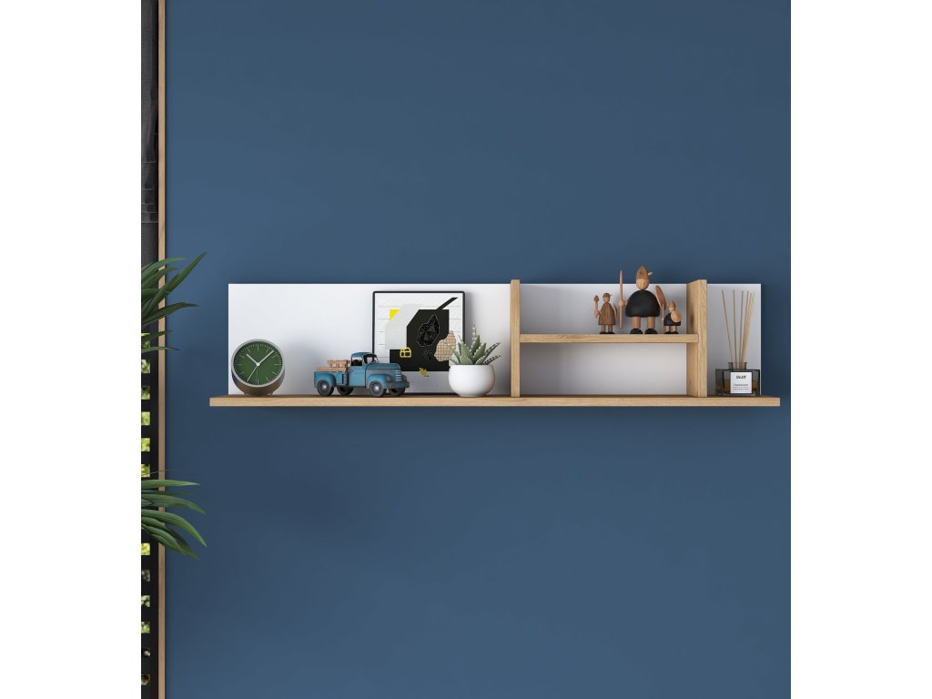 Nástěnná police přináší do vašeho interiéru moderní design a funkčnost. Kombinace bílé barvy a dekoru ořechu dodává prostoru stylový vzhled, zatímco její praktické rozměry umožňují široké využití. Je ideální pro vystavení knih, dekorací nebo rostlin, a přitom šetří místo.