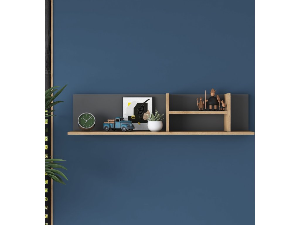 Nástěnná police je stylovým a funkčním řešením pro každý moderní interiér. Díky kombinaci ořechu a antracitu přidává prostoru eleganci a univerzálnost. Je ideální pro umístění knih, dekorací nebo jiných předmětů, které chcete mít na dosah a zároveň vkusně vystavené.