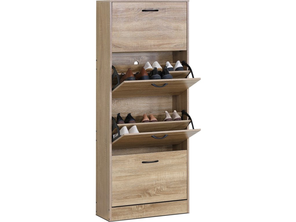 Botník s čtyřmi přihrádkami v dekoru dub je vyroben z MDF desek s povrchovou úpravou, která napodobuje přírodní strukturu dřeva. Každá přihrádka je opatřena černou kovovou úchytkou pro snadné otevírání a zavírání. Kompaktní a vysoký design umožňuje efektivní uspořádání obuvi i v menších prostorách, přičemž pevná konstrukce zajišťuje stabilitu a dlouhou životnost. Botník je vhodný do předsíní, chodeb nebo šaten, kde pomáhá udržet pořádek a přehlednost. Jeho rozměry a materiál se snadno udržují a odpovídají běžným požadavkům na domácí nábytek.