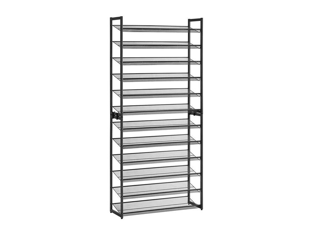 Černý kovový botník s dvanácti policemi nabízí praktické a vzdušné řešení pro uskladnění obuvi v domácnosti. Ocelová konstrukce je navržena pro dlouhou životnost a stabilitu, přičemž otevřená police umožňuje snadnou orientaci a větrání uložených bot. Díky kompaktním rozměrům a minimalistickému designu se botník hodí do různých interiérů, od předsíní po šatny. Povrchová úprava v černé barvě zajišťuje odolnost proti poškození a snadnou údržbu. Celková kapacita dvanácti polic poskytuje dostatek prostoru pro organizaci obuvi celé rodiny.