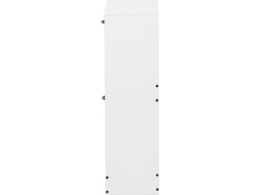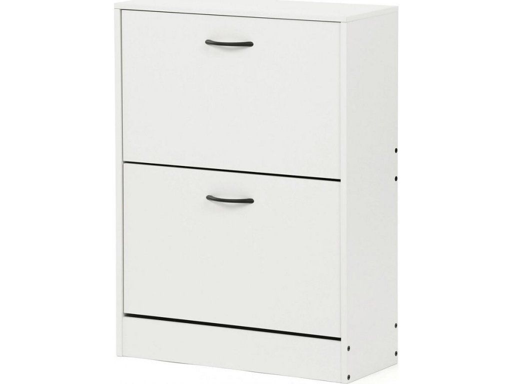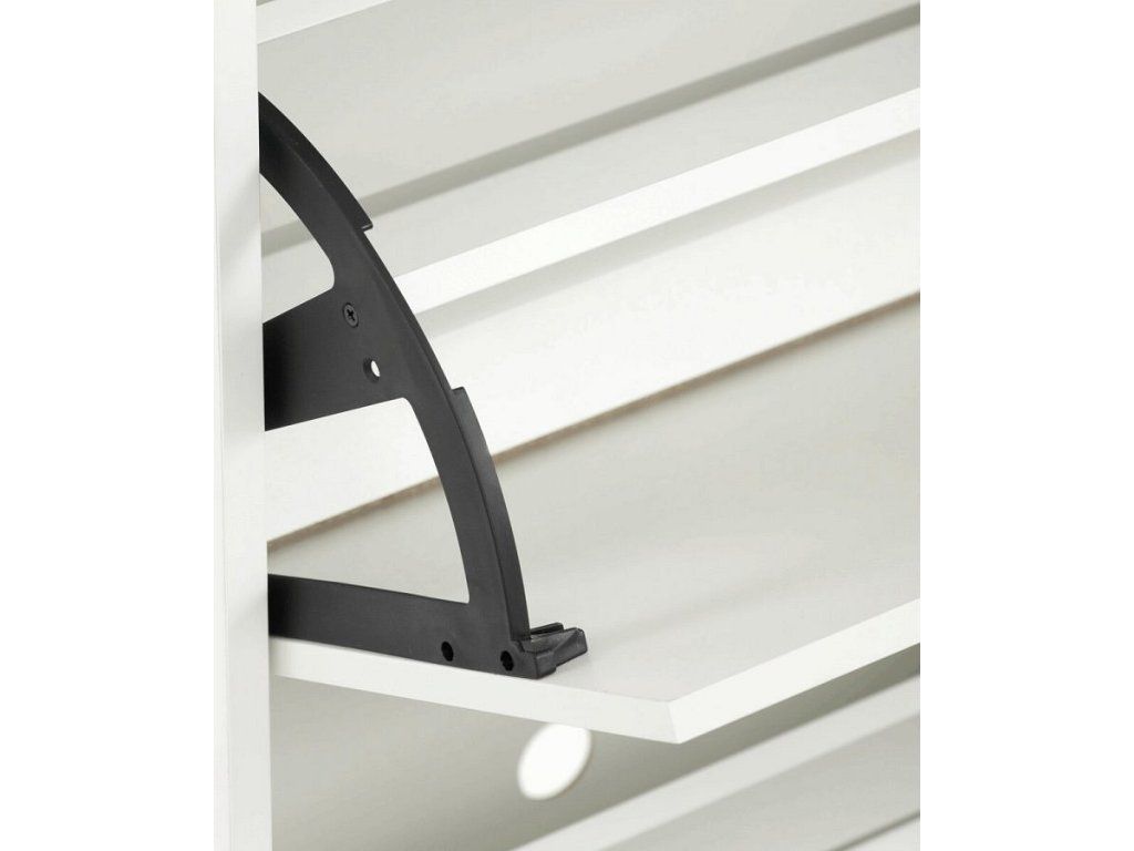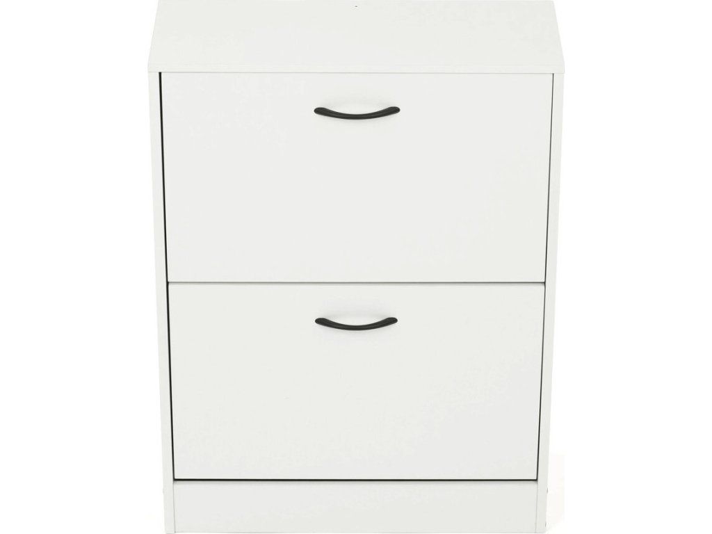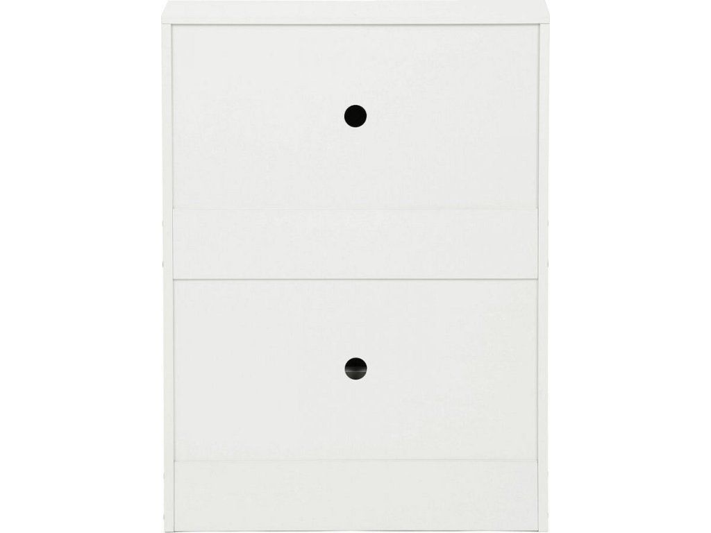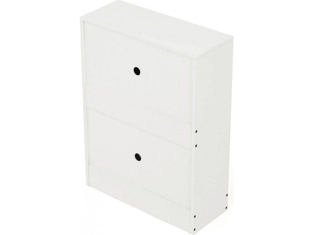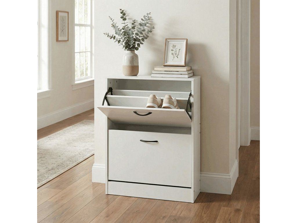 Botník s dvěma přihrádkami je vyroben z MDF desek v bílé barvě, které zajišťují pevnost a stabilitu celého kusu nábytku. Každá přihrádka je vybavena otevíracím mechanismem s černými kovovými panty, které umožňují snadný přístup k uloženým botám a zároveň pevné držení přihrádky v zavřené poloze. Kompaktní rozměry botníku umožňují jeho umístění i do menších prostor, přičemž horní deska nabízí možnost využití jako odkládací plocha. Povrchová úprava MDF desek je hladká a snadno se udržuje, což přispívá k dlouhé životnosti produktu. Botník je vhodný pro uložení několika párů obuvi a pomáhá udržet pořádek v předsíni či chodbě.