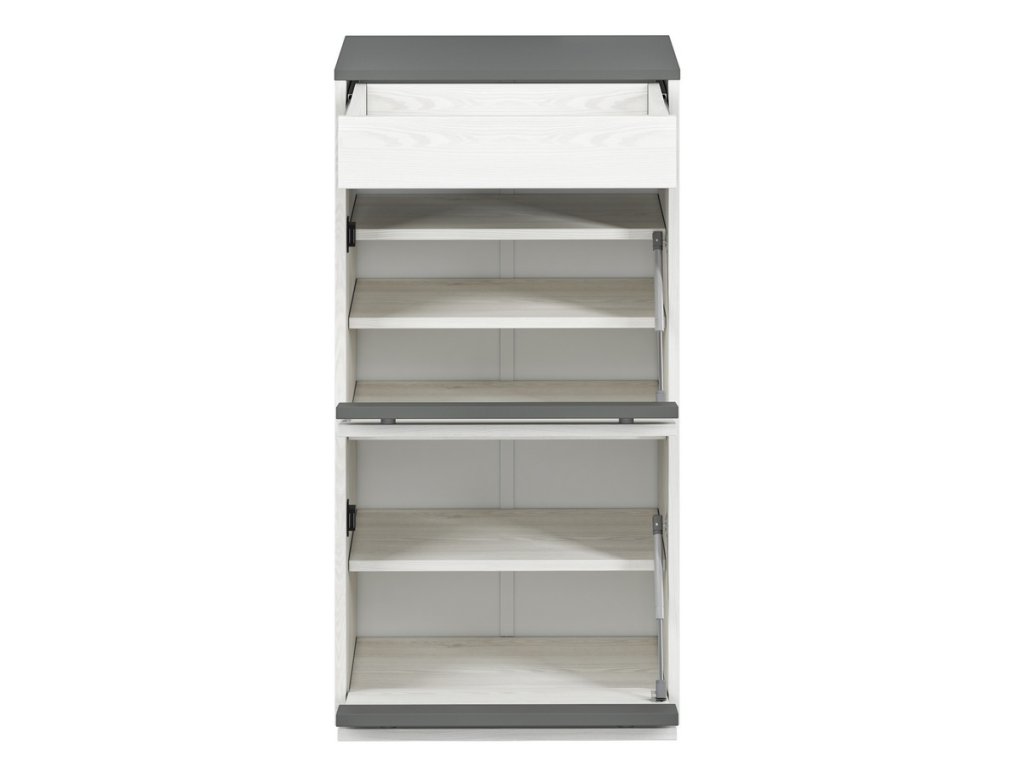 CASA 56015 Botník se dvěma výklopnými dvířky nad sebou a praktickou zásuvkou v horní části je vyroben z desky LTD v kombinaci barev borovice sněžná/antracit. Dodáváme v demontovaném stavu.