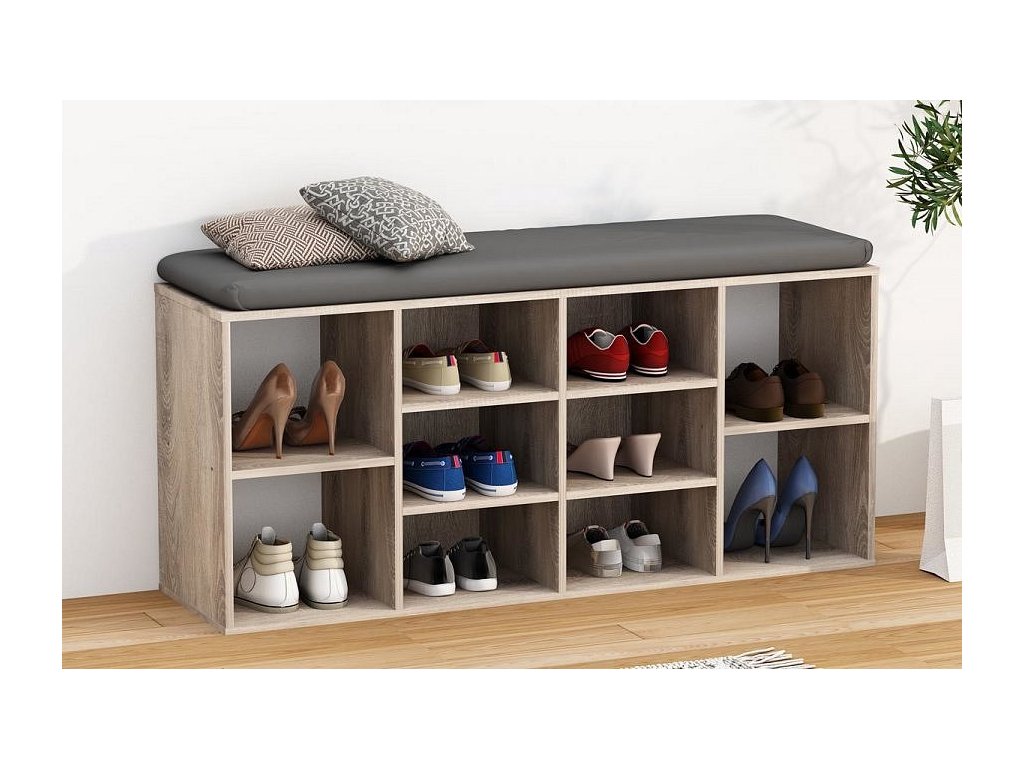 Designový botník Hinsol je praktický a stylový botník do předsíně, který nabízí skvělé řešení pro ukládání obuvi i drobností. Tento moderní botník na boty kombinuje funkčnost s elegantním vzhledem, takže zapadne do každého interiéru. Díky deseti přihrádkám poskytuje dostatek prostoru až pro deset párů bot nebo jiné nezbytnosti, které je vhodné mít v nábytku do předsíně po ruce. Horní plocha zároveň slouží jako pohodlné sedátko – botník tak funguje i jako praktický botník s lavicí, ideální pro pohodlné obouvání.