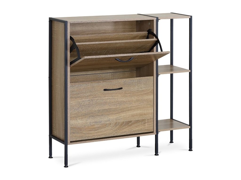 Botník v dekoru dub kombinuje praktické úložné prostory s moderním designem. Je vyroben z MDF desek s povrchovou úpravou v odstínech přírodního dřeva, která je snadno udržovatelná. Nabízí dvě přihrádky s výklopnými dvířky pro uložení obuvi a tři otevřené police na doplňky nebo dekorace. Černé kovové nohy a úchytky dodávají botníku stabilitu a industriální vzhled. Kompaktní rozměry umožňují umístění do předsíní i menších prostor.