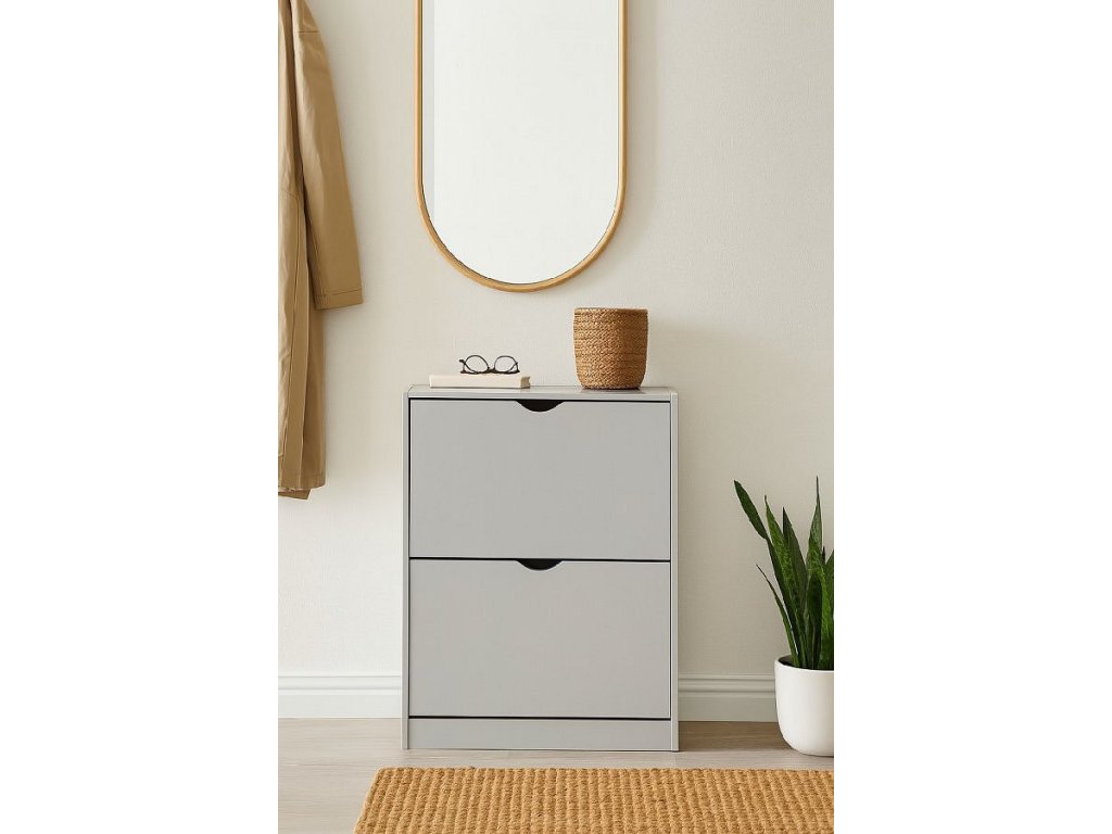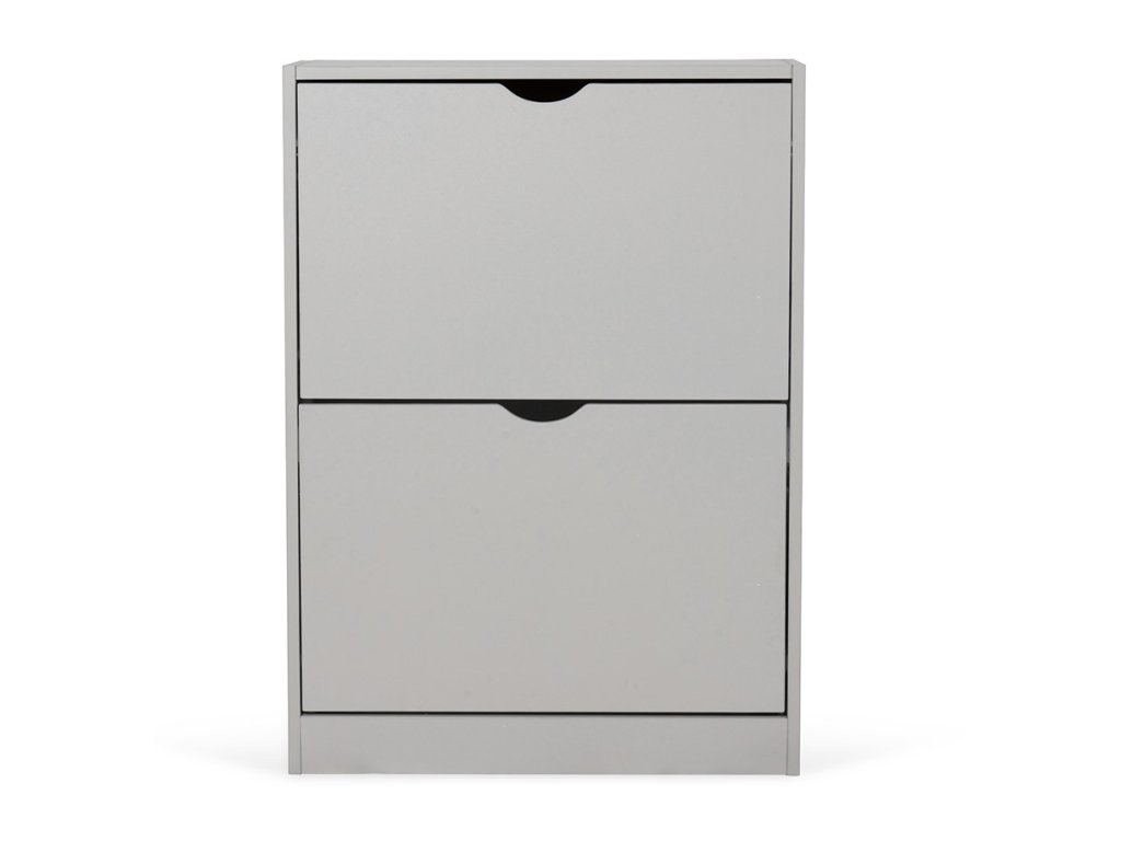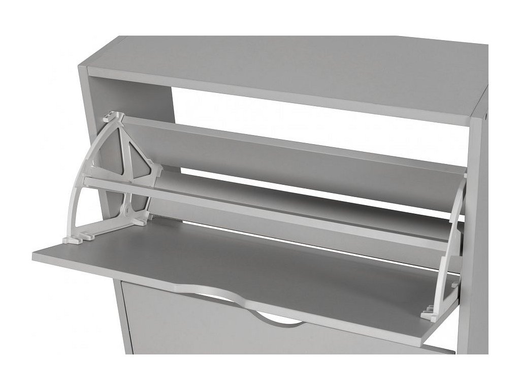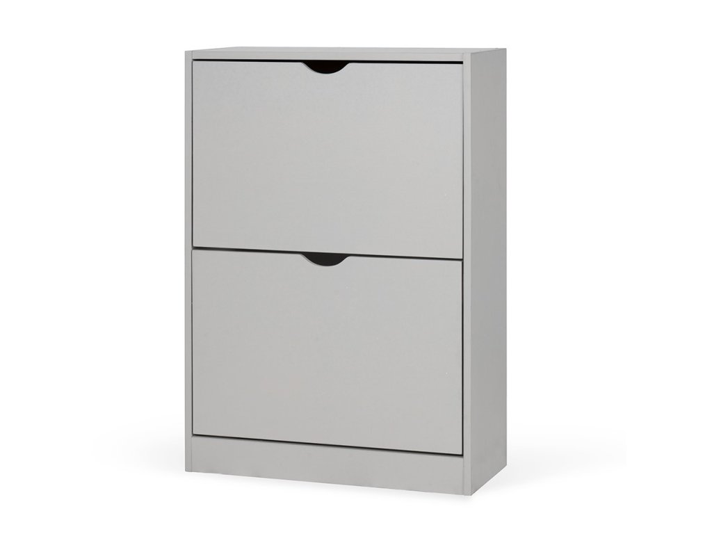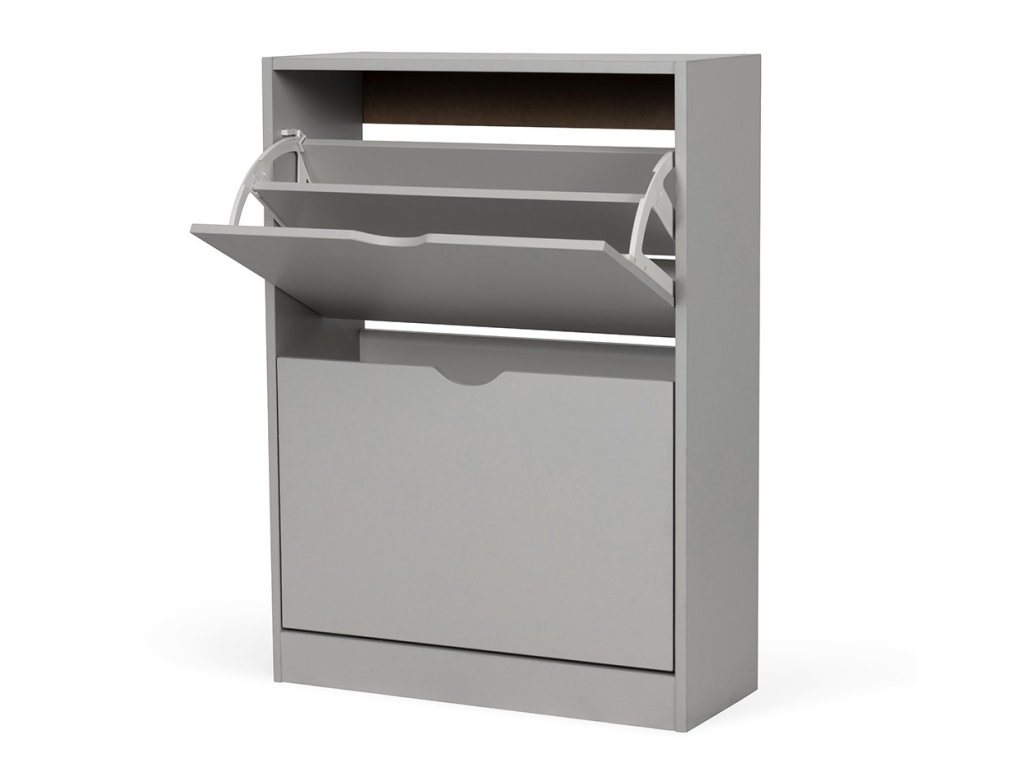 Botník z laminované dřevotřísky v šedé barvě, dvě výklopné přihrádky, bez zadní desky.